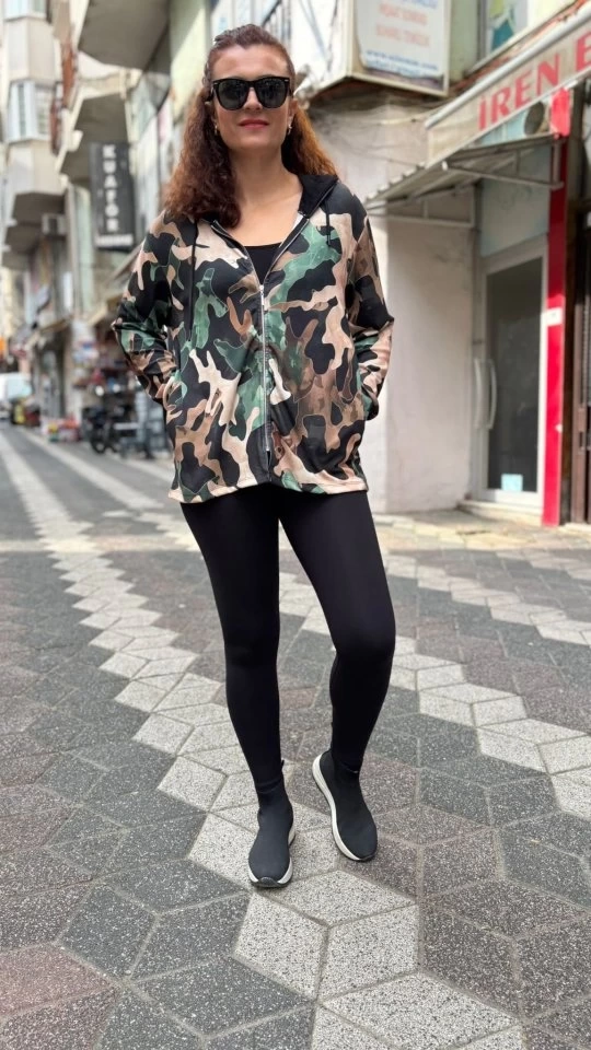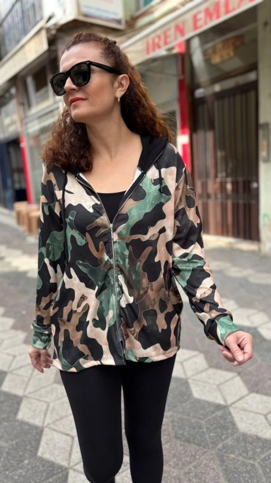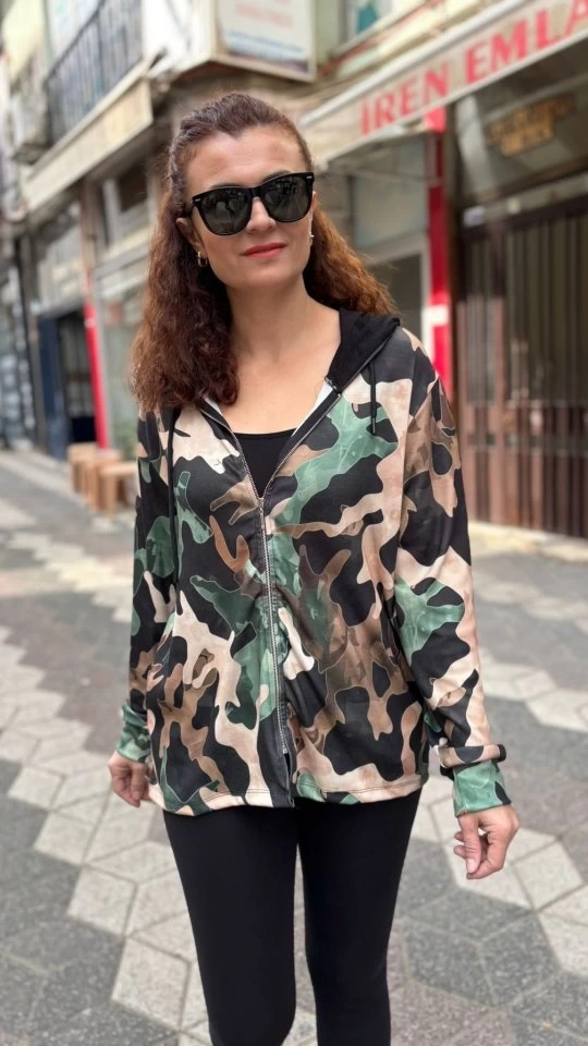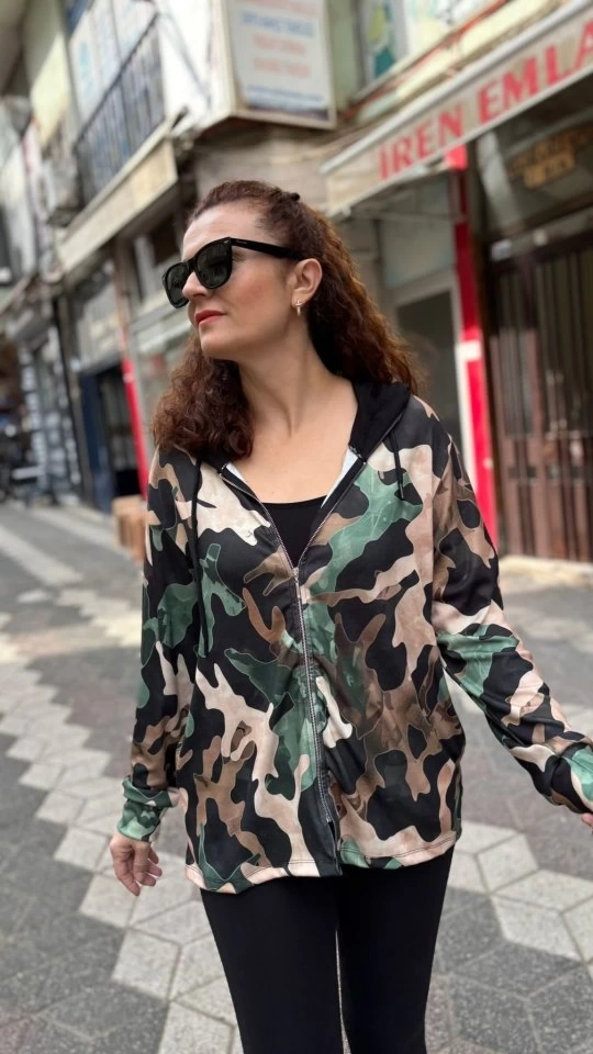 Kadın Uzun Kollu Kapüşon Detay Dijital Baskılı Ceket