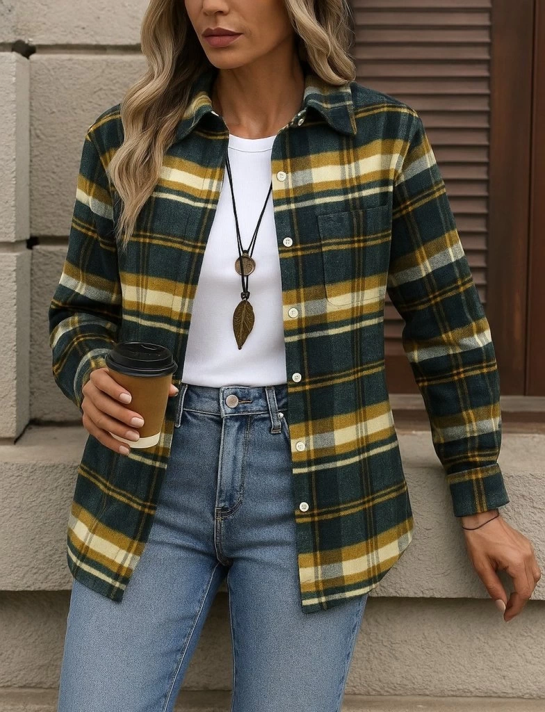 Kadın Uzun Kollu Kare Desenli önden Düğmeli Dokuma Gömlek
