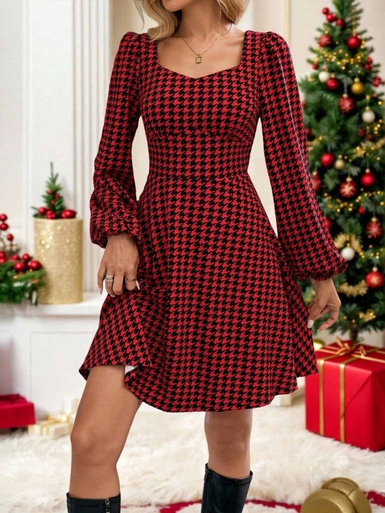 Kadın Uzun Kollu Kare Kalp Yakalı Mini Modal Elbise