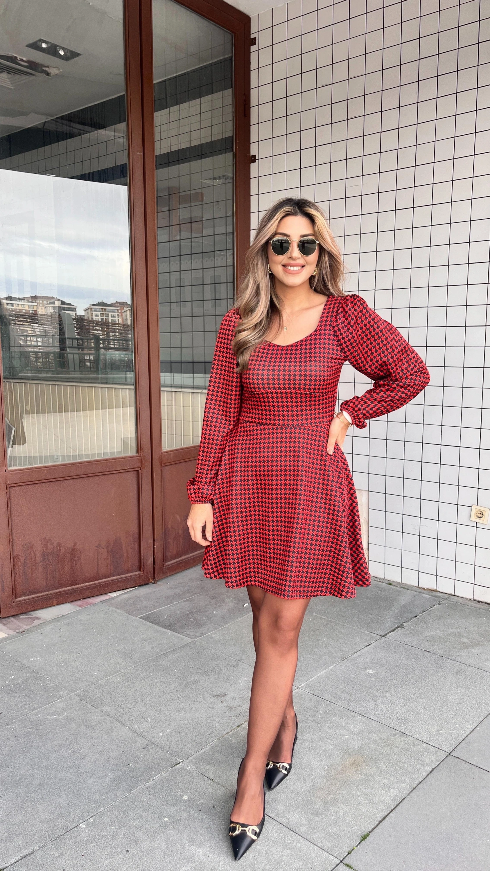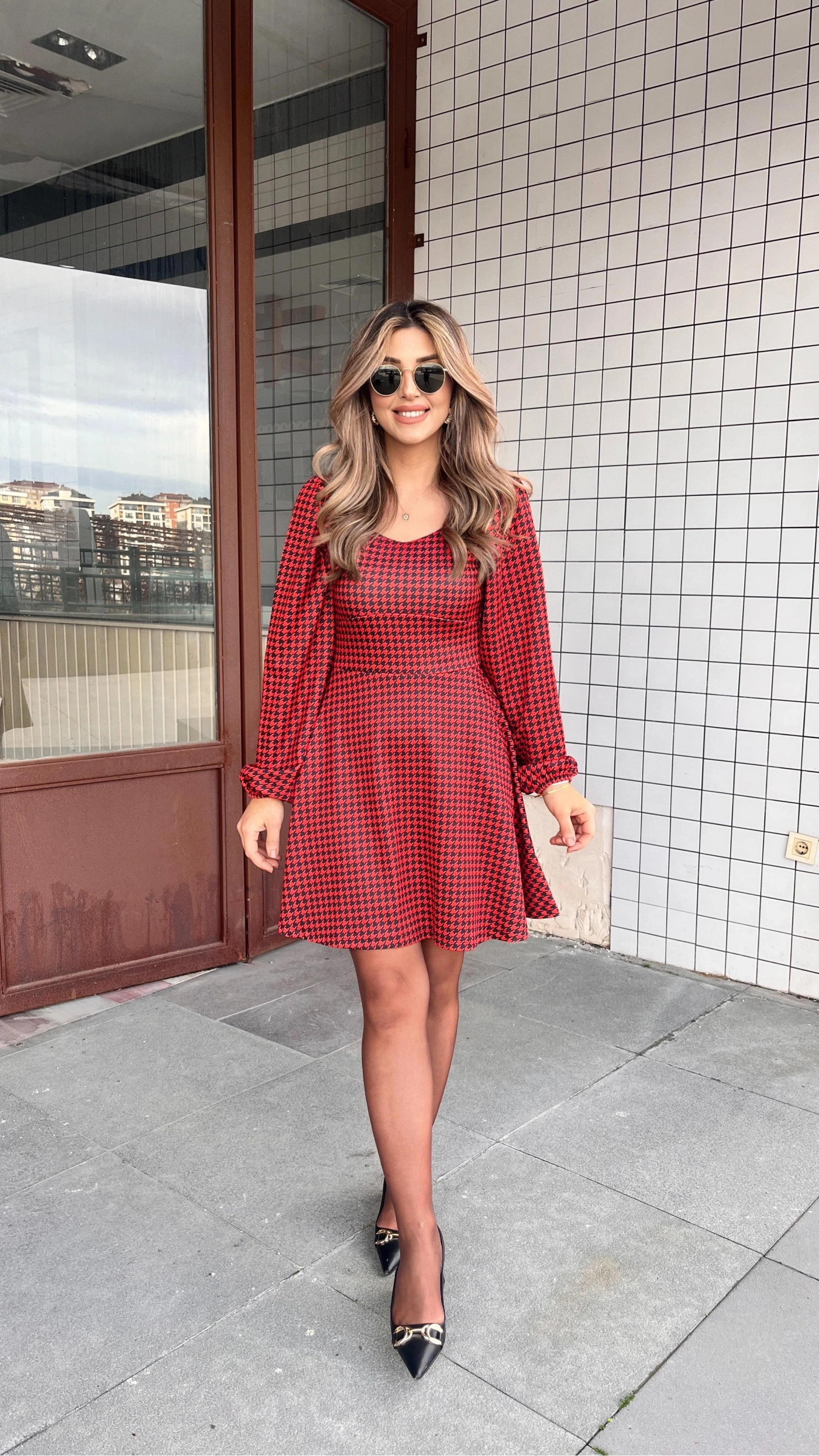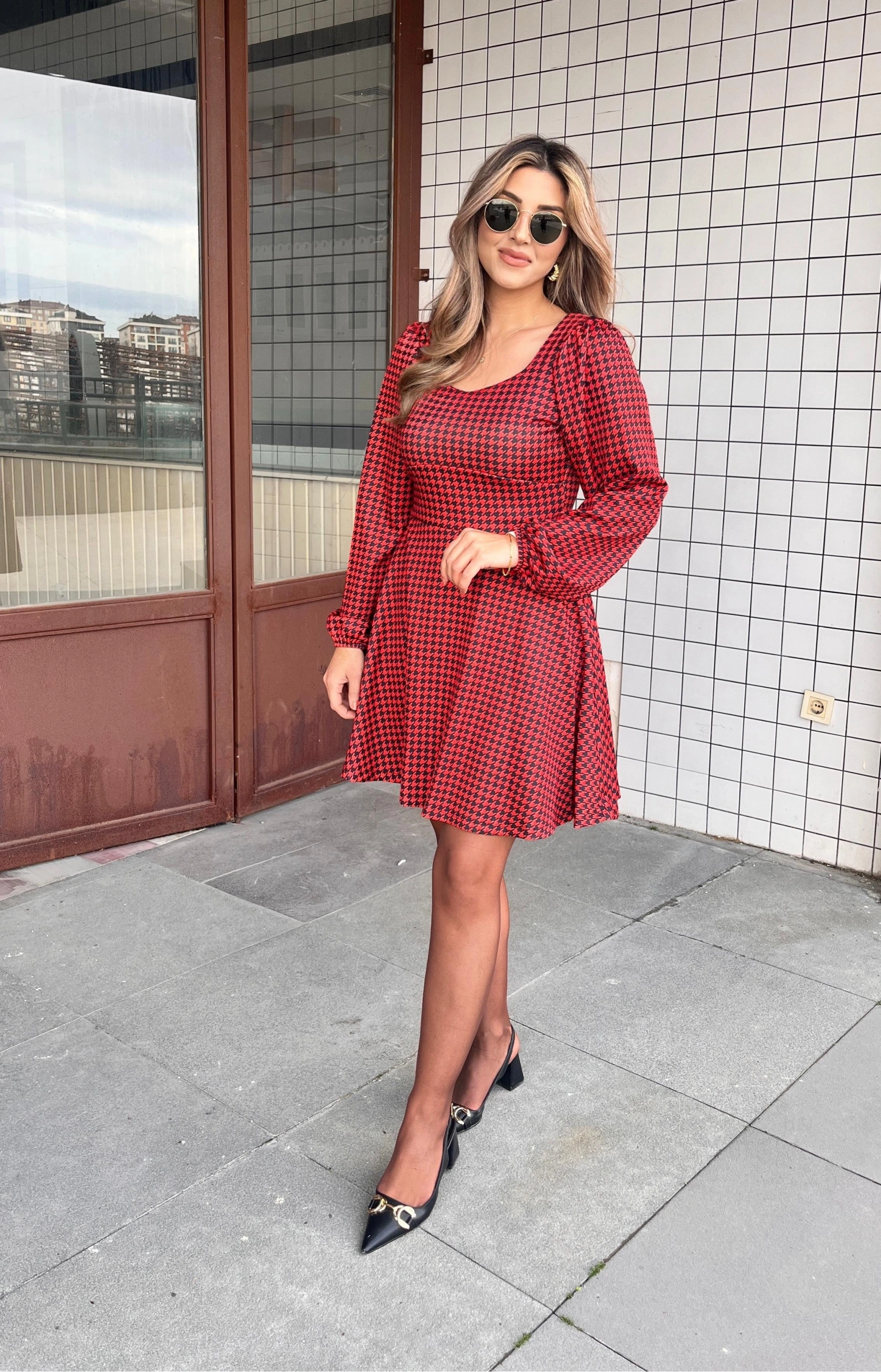 Kadın Uzun Kollu Kare Kalp Yakalı Mini Modal Elbise