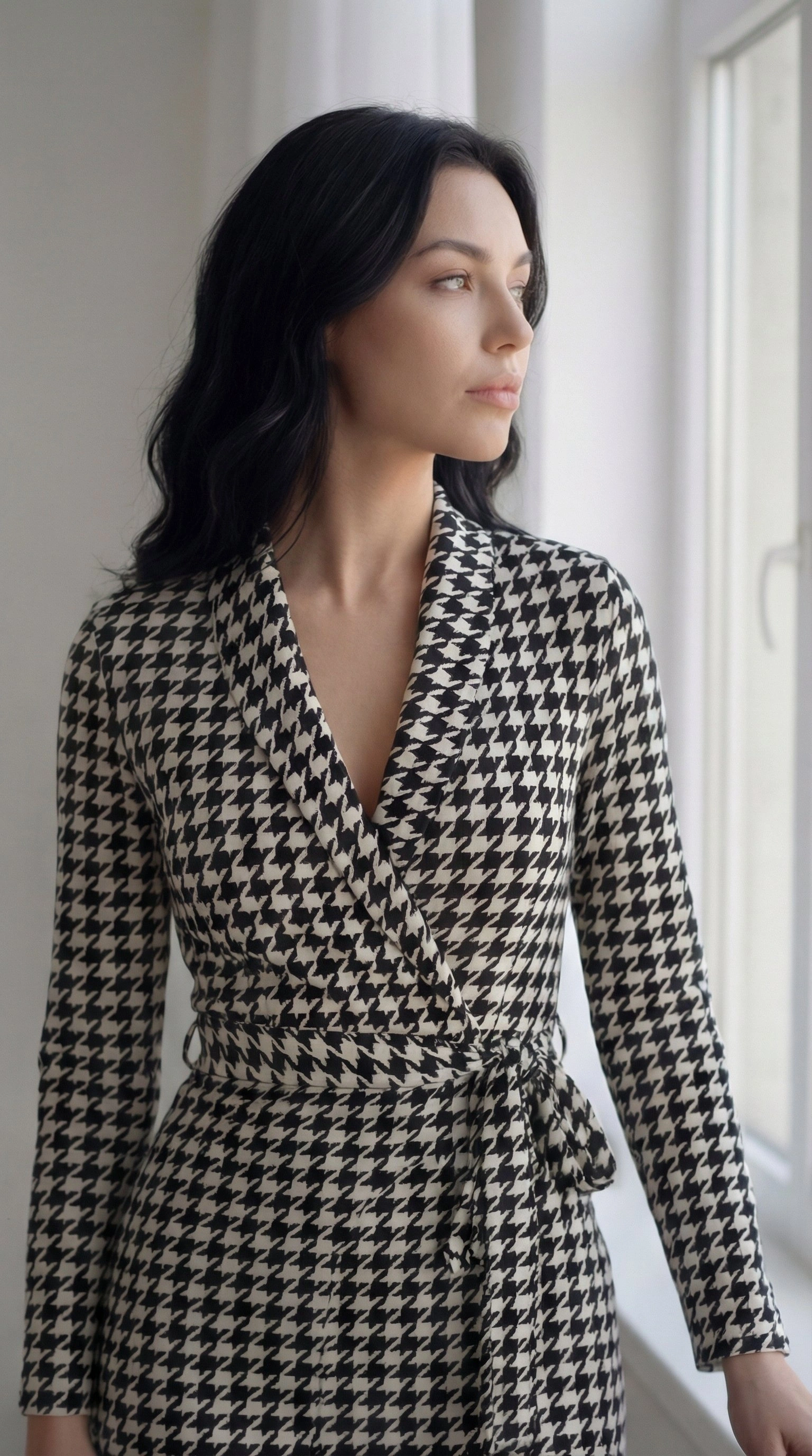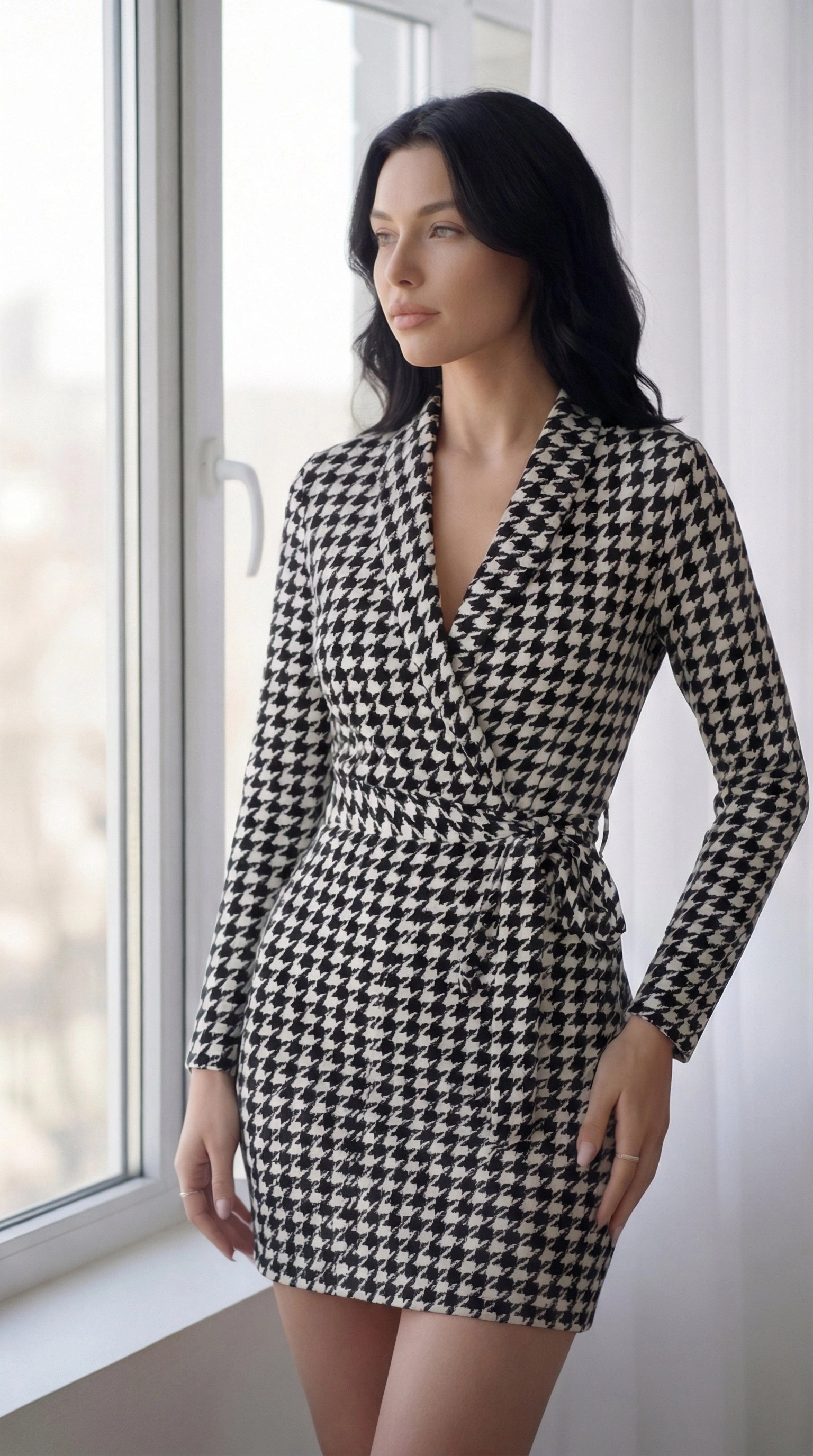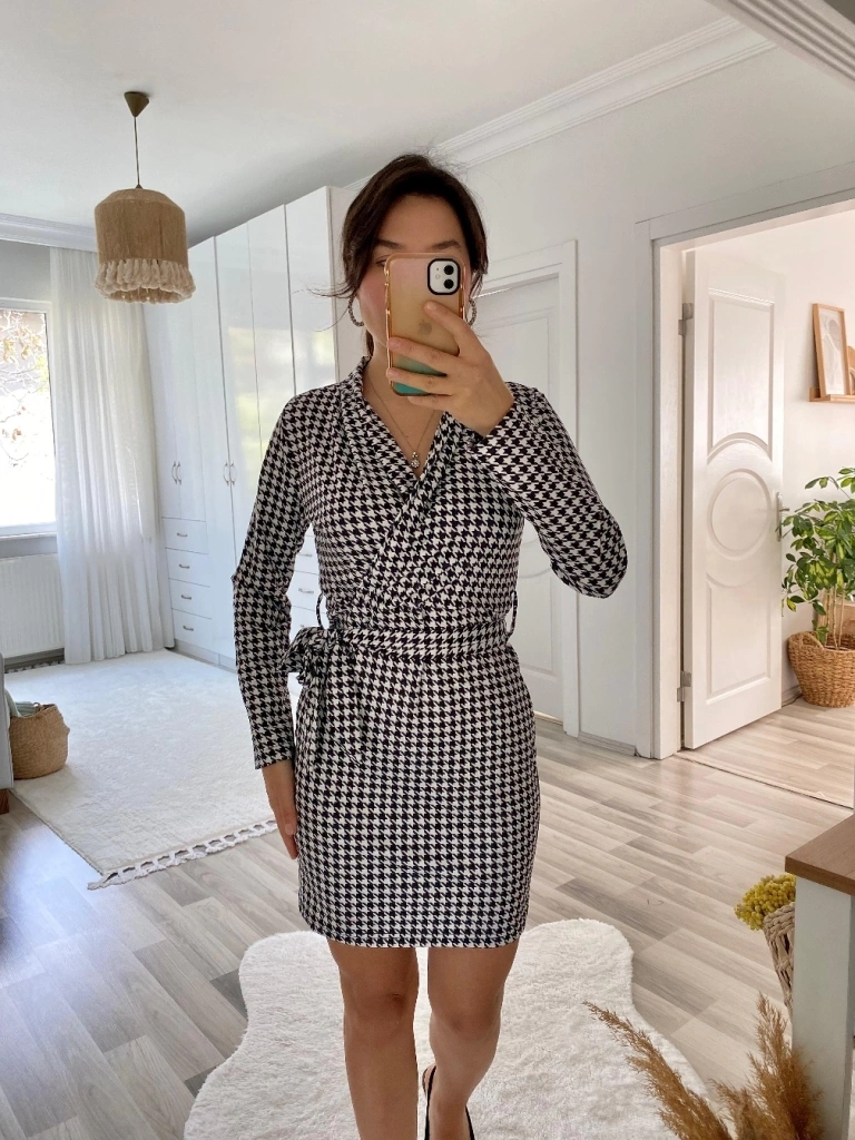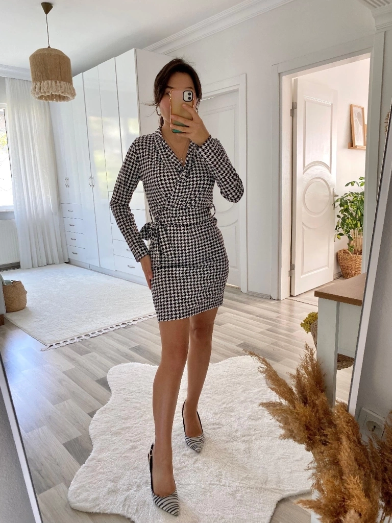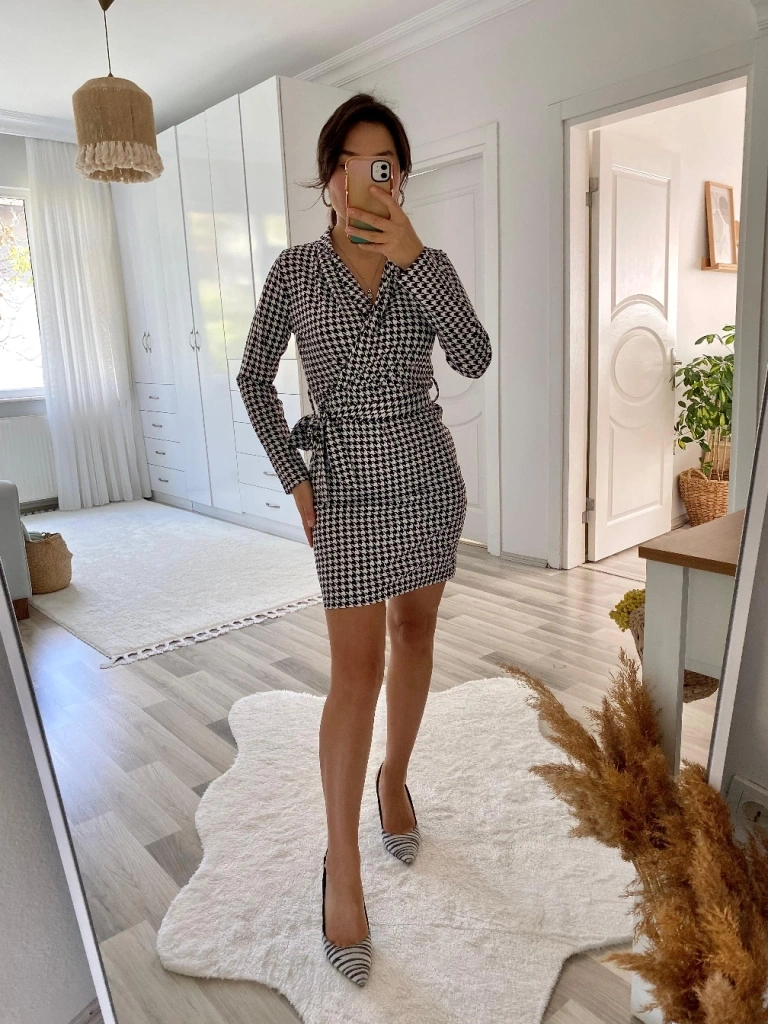 Kadın Uzun Kollu Kruvaze Yaka Bağlamalı Kemer Dalgıç Mini Boy Elbise