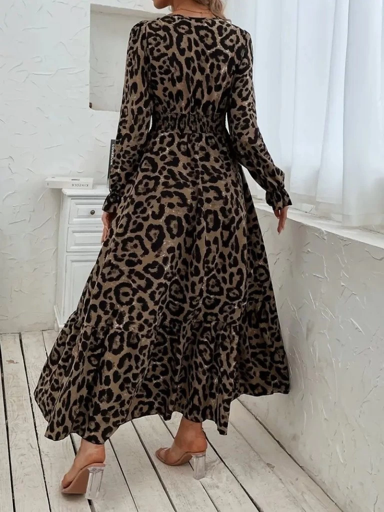 Kadın Uzun Kollu Kruvaze Yaka Leopar Desenli Uzun Süprem Elbise