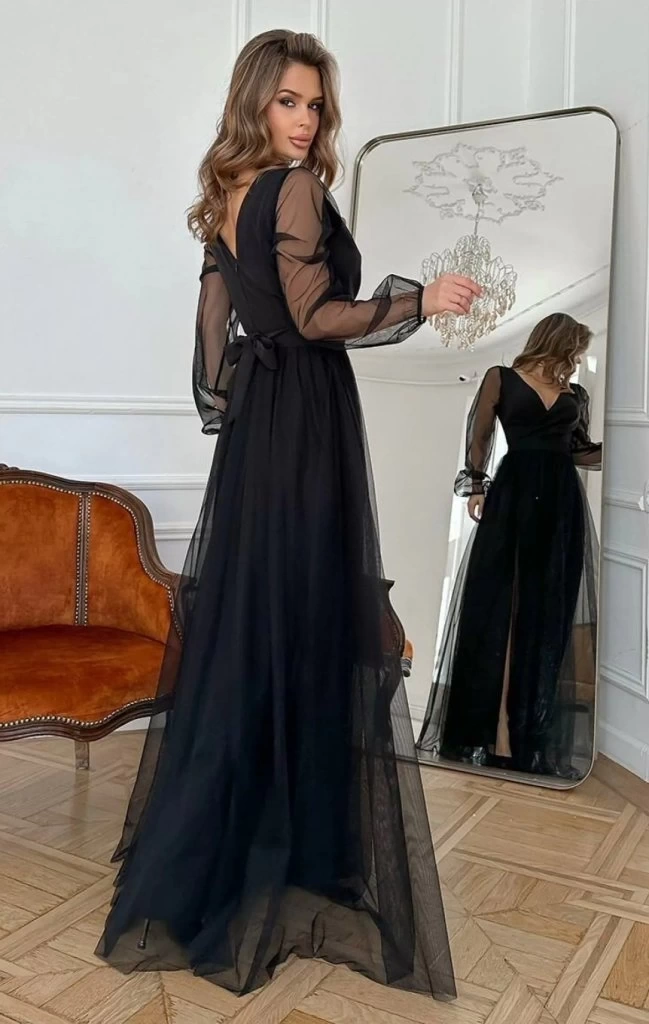 Kadın Uzun Kollu Kruvaze Yakalı Belden Kuşaklı Tüllü Uzun Ithal Krep Elbise