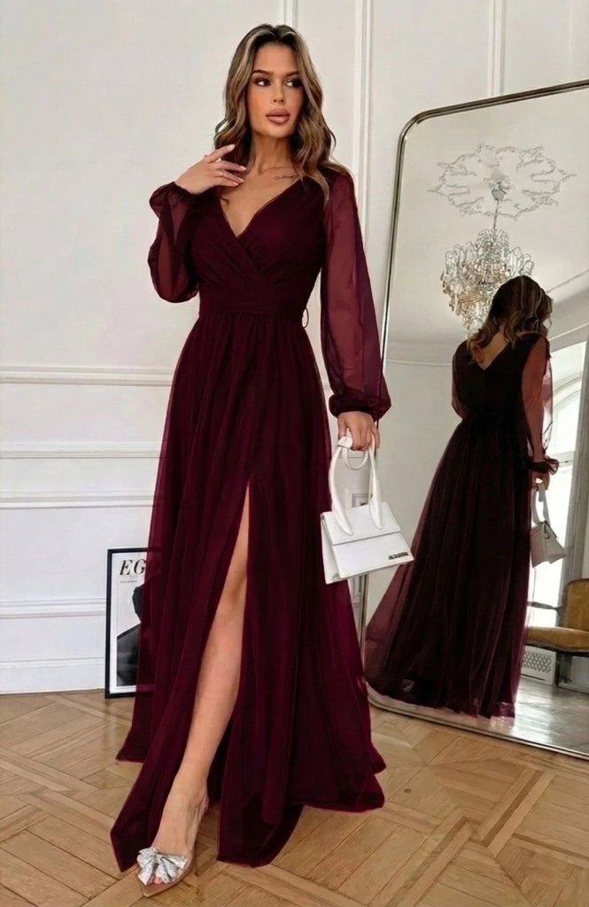 Kadın Uzun Kollu Kruvaze Yakalı Belden Kuşaklı Tüllü Uzun Ithal Krep Elbise