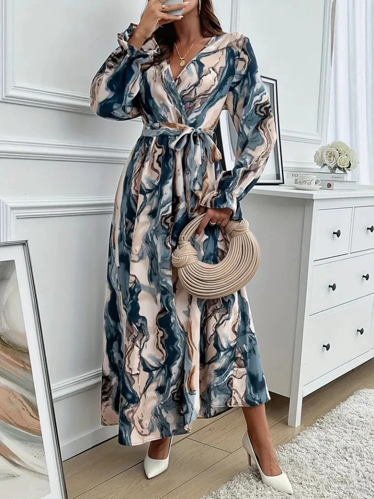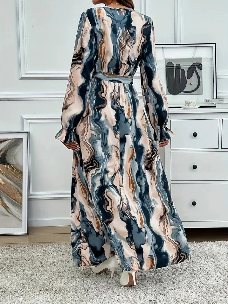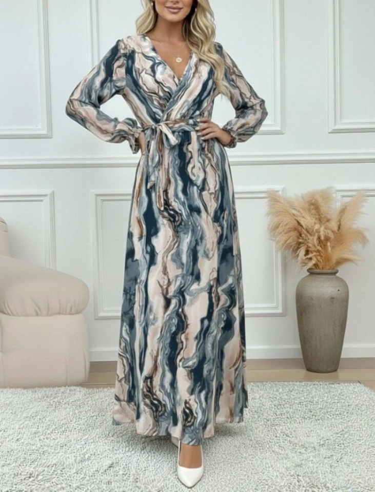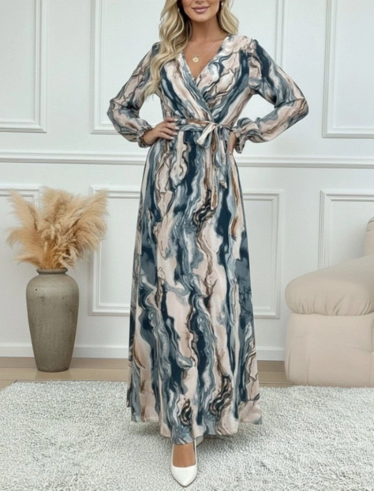 Kadın Uzun Kollu Kruvaze Yakalı Beli Kuşaklı Desenli Süprem Maxi Elbise