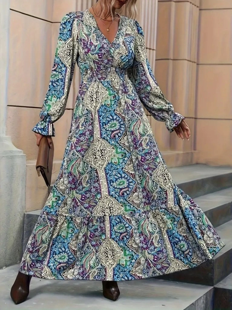 Kadın Uzun Kollu Kruvaze Yakalı Desenli Süprem Maxi Elbise