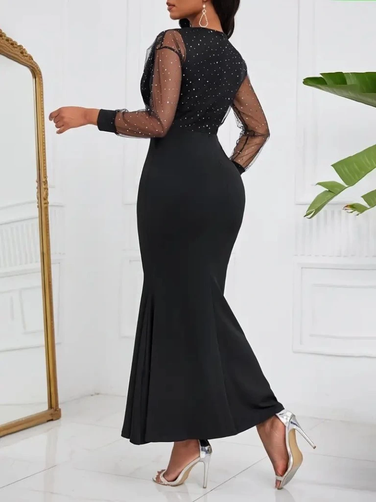 Kadın Uzun Kollu Kruvaze Yakalı Taş Ve Tül Detaylı Uzun Ithal Krep Elbise