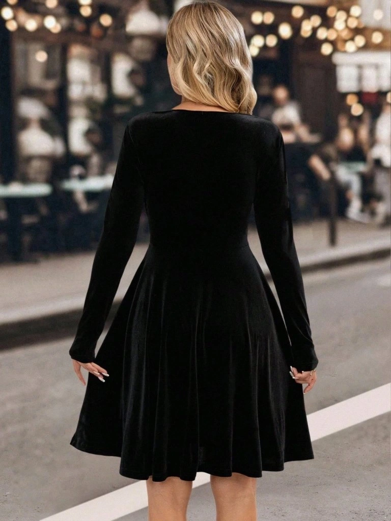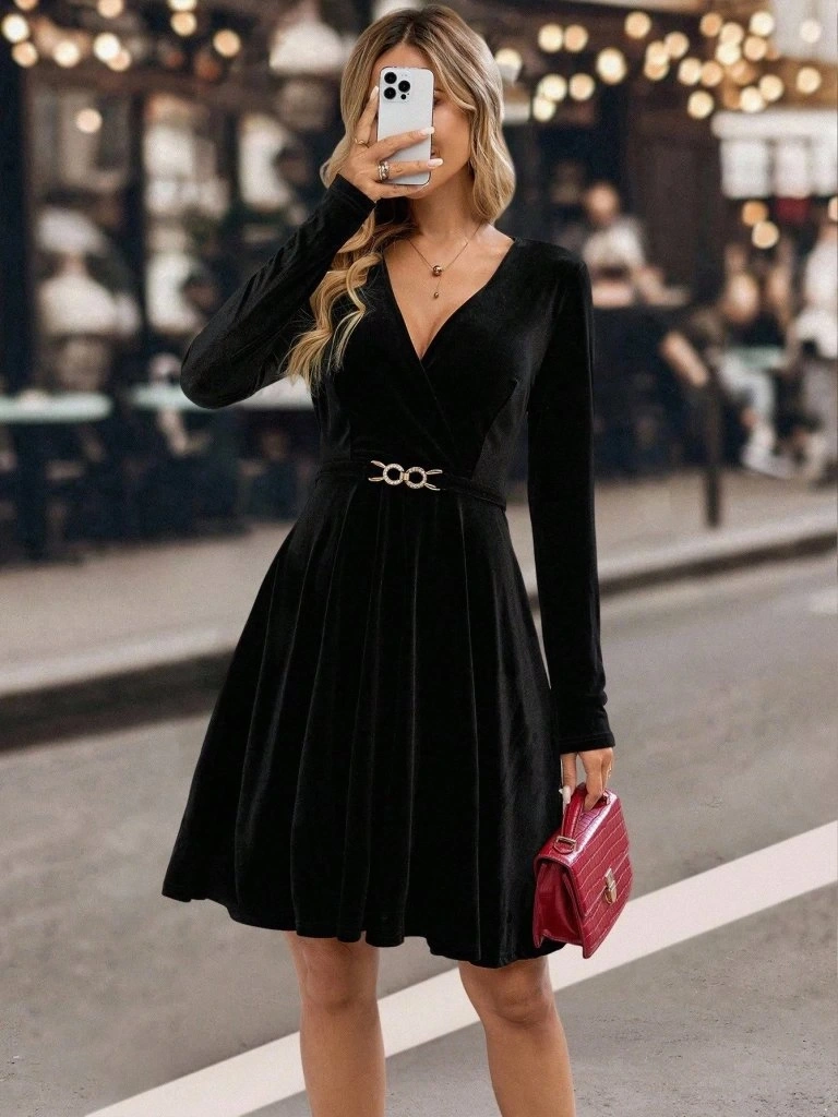 Kadın Uzun Kollu Kruvaze Yakalı Toka Detaylı Mini Kadife Elbise