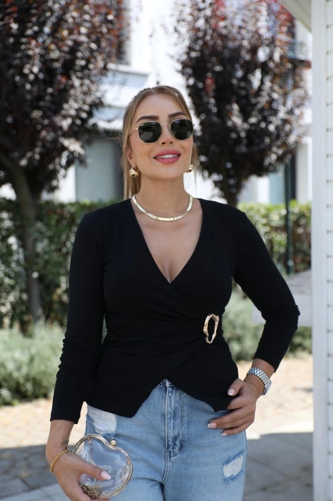 Kadın Uzun Kollu Kruvaze Yakalı Toka Detaylı Viskon Bluz