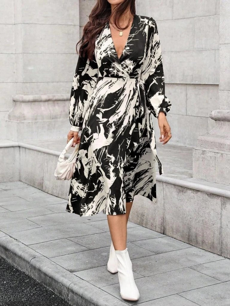 Kadın Uzun Kollu Kruvaze Yakalı Yandan Bağlamalı Desenli Mini Modal Elbise