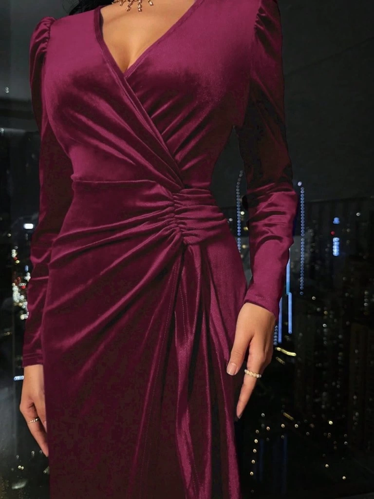 Kadın Uzun Kollu Kruvaze Yakalı Yandan Büzgülü Midi Kadife Elbise