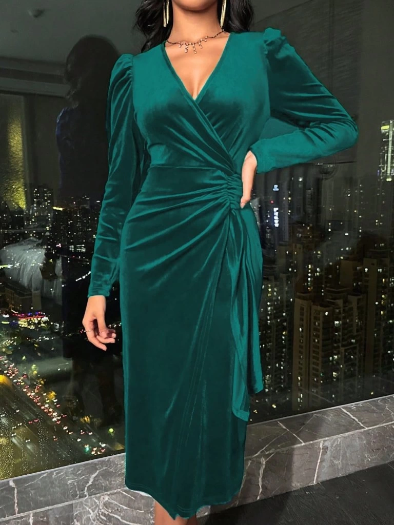 Kadın Uzun Kollu Kruvaze Yakalı Yandan Büzgülü Midi Kadife Elbise