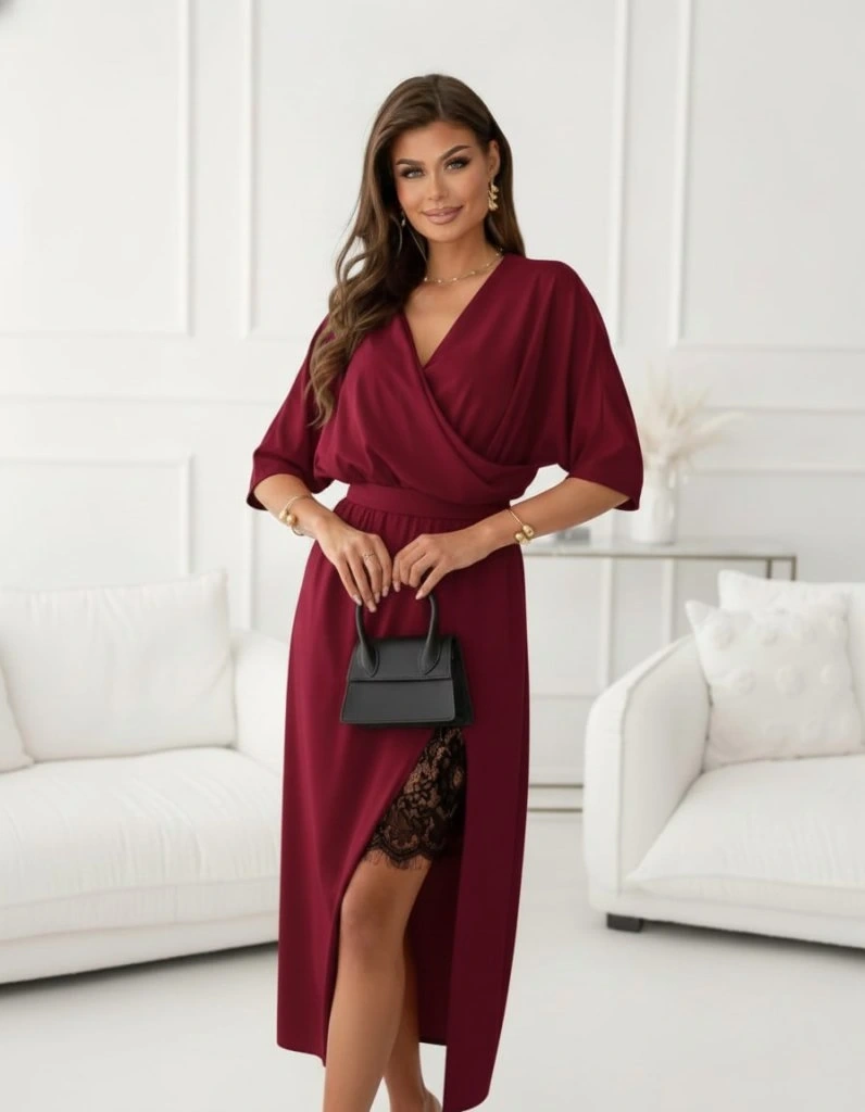 Kadın Uzun Kollu Kruvaze Yakalı Yandan Dantelli Midi Ithal Krep Elbise