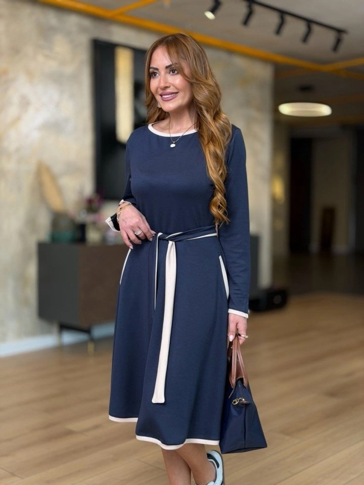 Kadın Uzun Kollu Kuşak Dahil Midi Boy Lbise