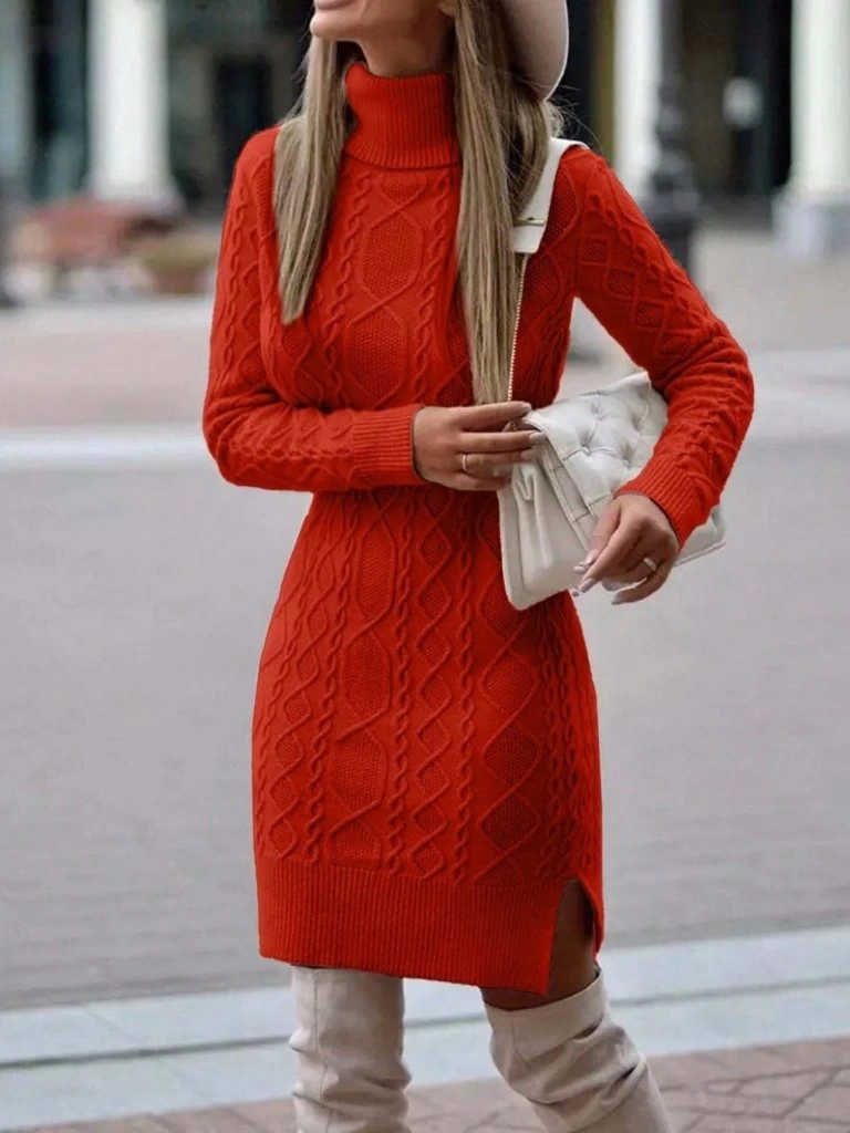 Kadın Uzun Kollu Loren Yünlü Motifli Midi Boy Triko Elbise