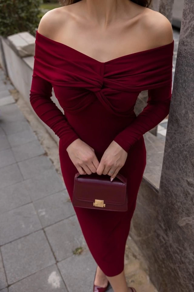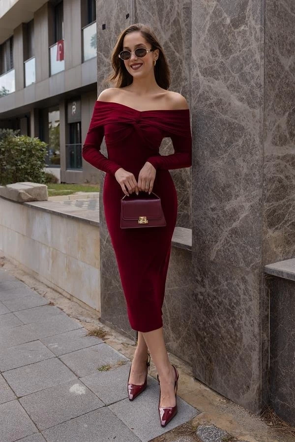 Kadın Uzun Kollu Madonna Yaka Düğüm Büzgü Detay Maxi Boy Elblbise