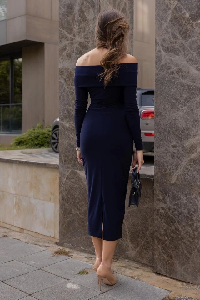 Kadın Uzun Kollu Madonna Yaka Düğüm Büzgü Detay Maxi Boy Elblbise
