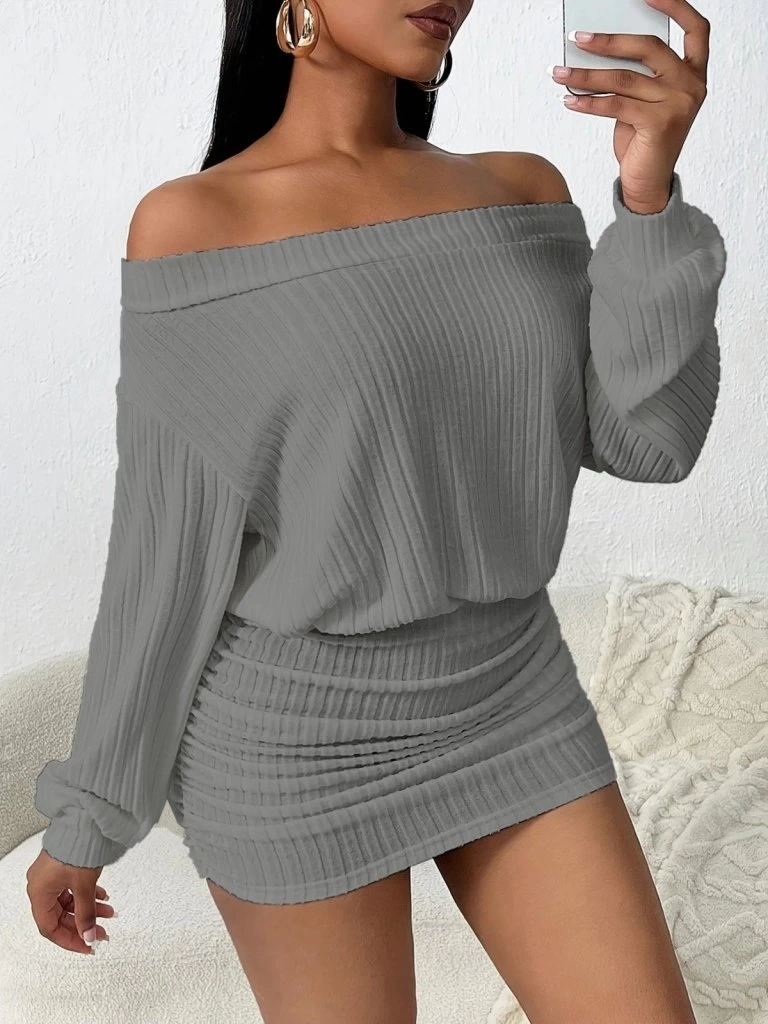 Kadın Uzun Kollu Madonna Yaka Yanlardan Büzgülü şardonlu Kaşkorse Mini Elbise