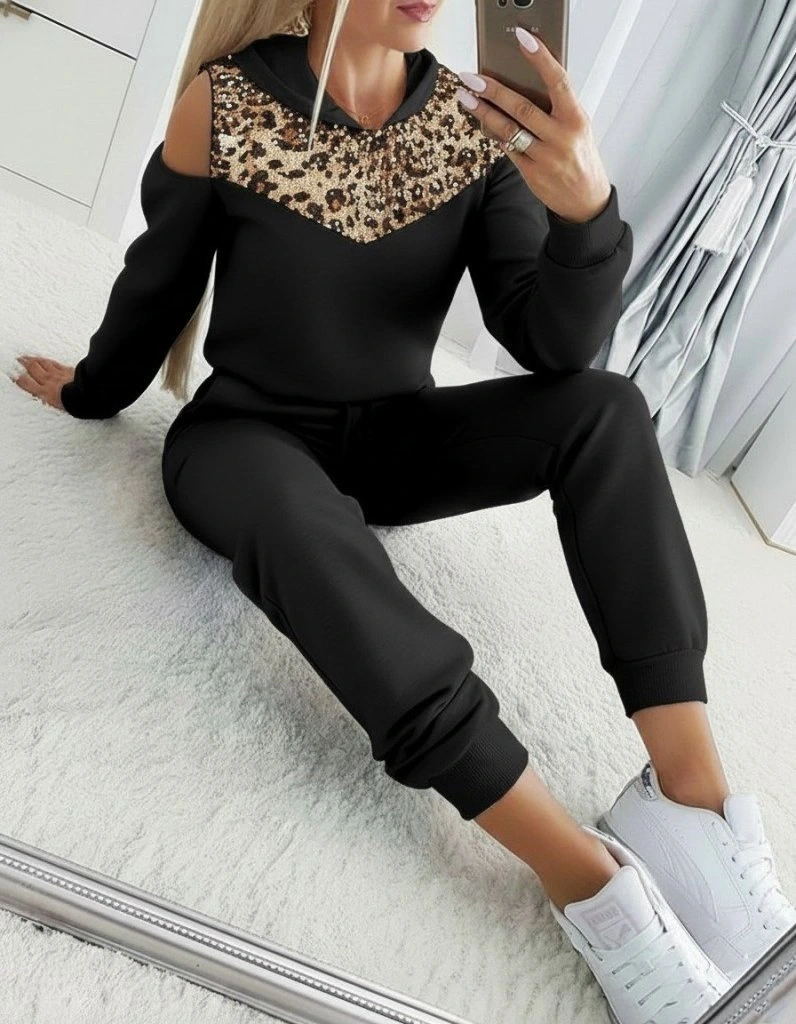 Kadın Uzun Kollu Omuzlardan Açık Leopar Desenli Kapşonlu Viskon Iki Iplik Bluz Ve Pantolon Ikili Takım
