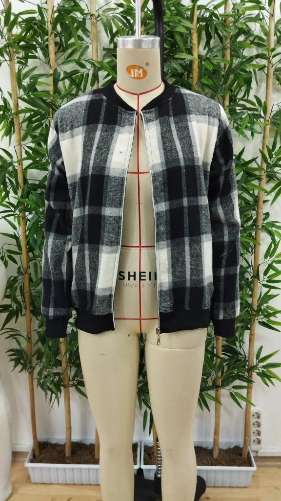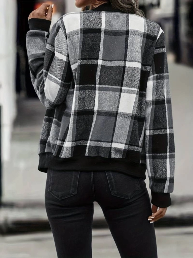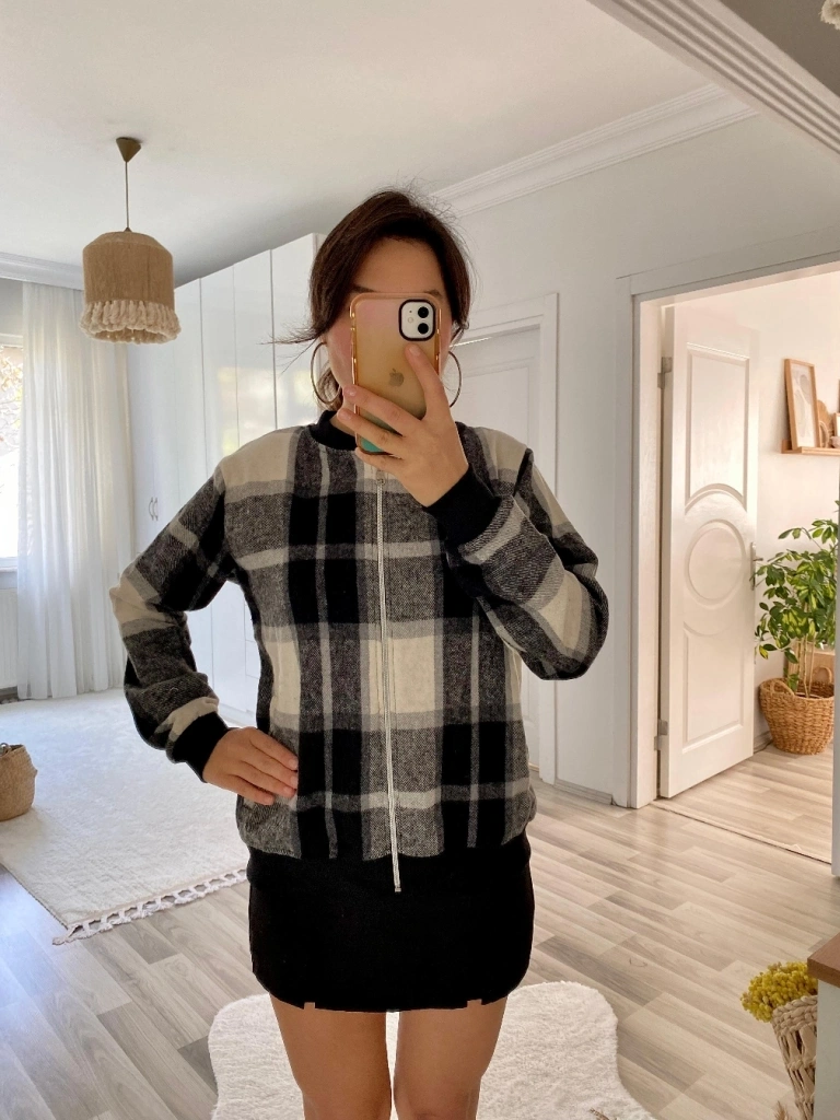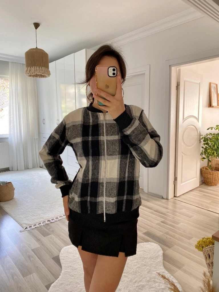 Kadın Uzun Kollu önden Fermuarlı Ekose Desenli Ceket