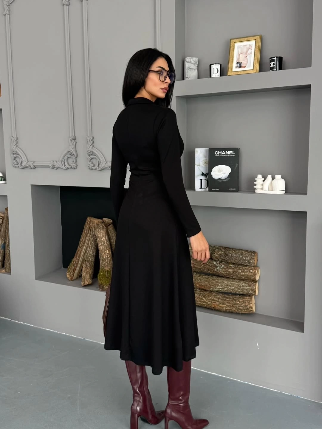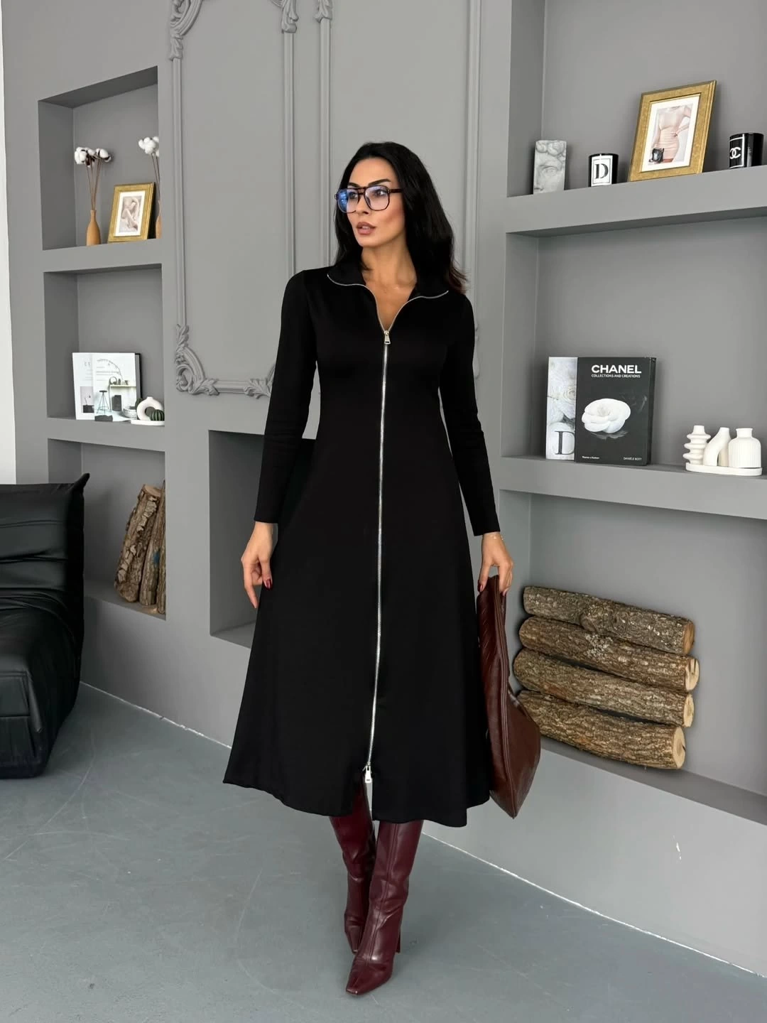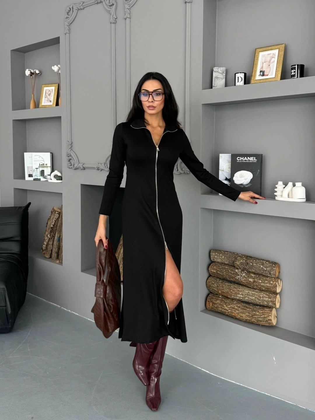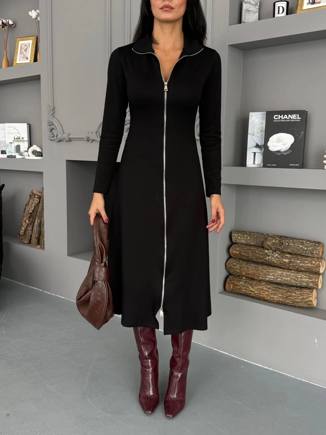 Kadın Uzun Kollu önden Fermuarlı Maxi Viskon Iki Iplik Elbise