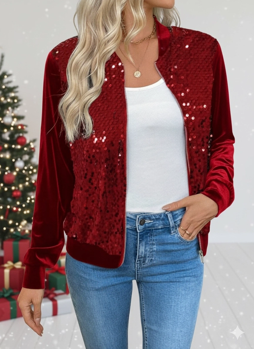 Kadın Uzun Kollu önü Açık Fermuarlı Pulpayetli Kadife Ceket