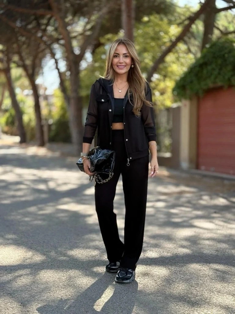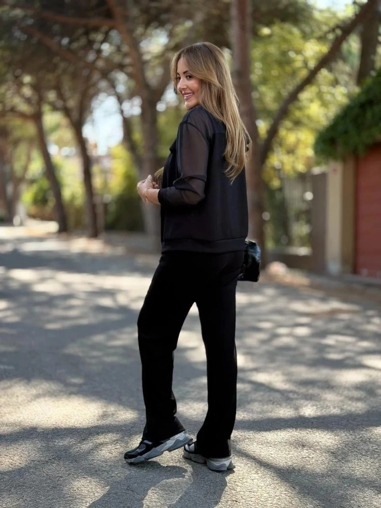 Kadın Uzun Kollu Tül Detaylı önü Düğmeli Viskon Iki Iplik Ceket Ve Pantolon Ikili Takım