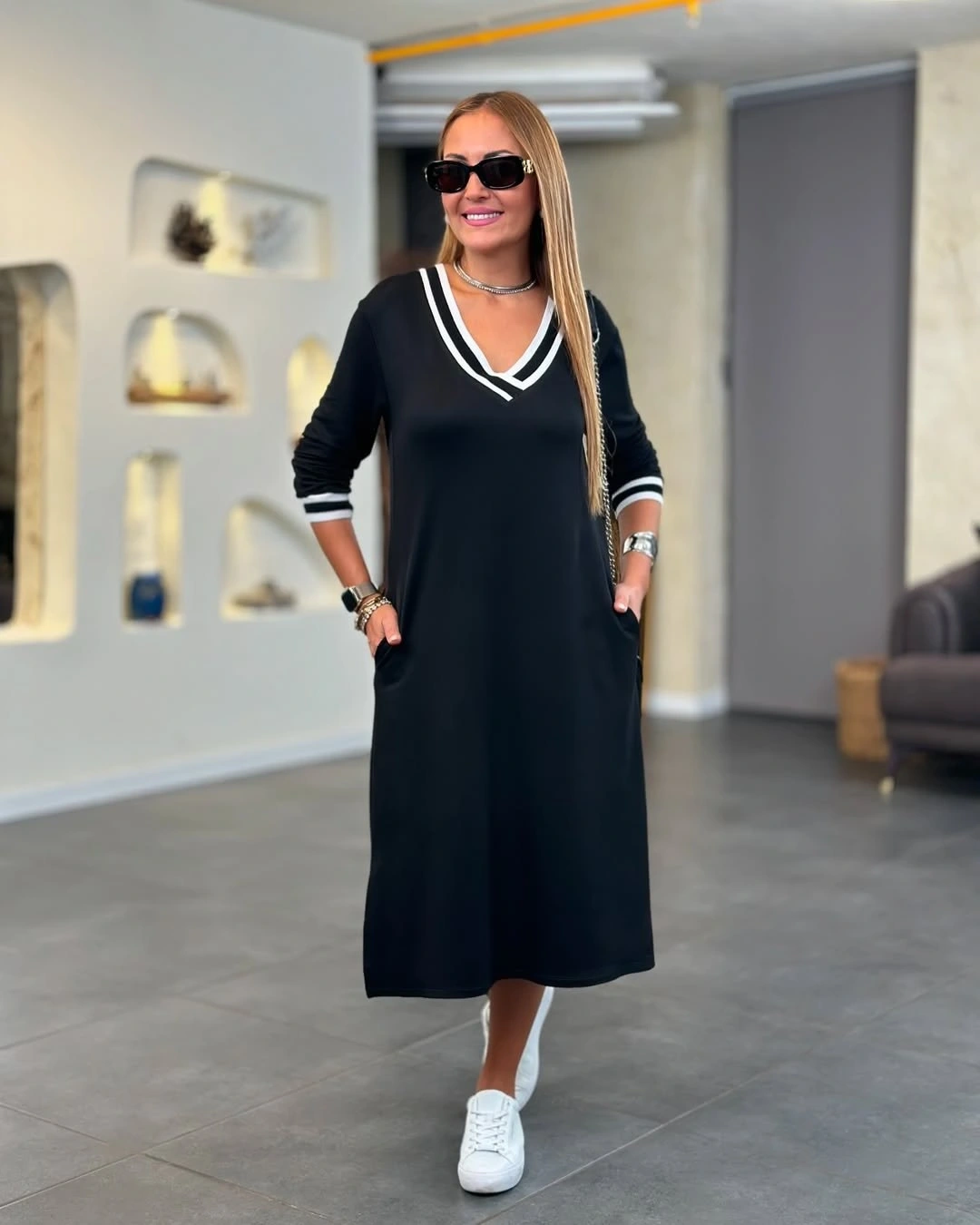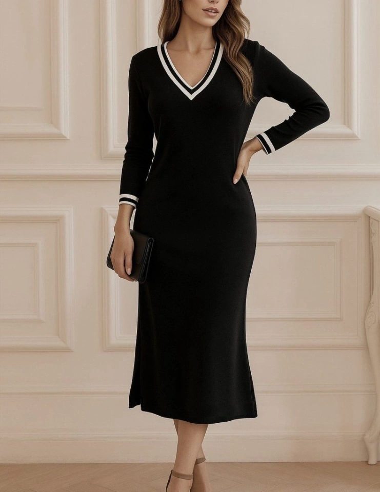 Kadın Uzun Kollu V Ribana Yakalı Yanlardan Yırtmaçlı Midi Viskon Iki Iplik Elbise