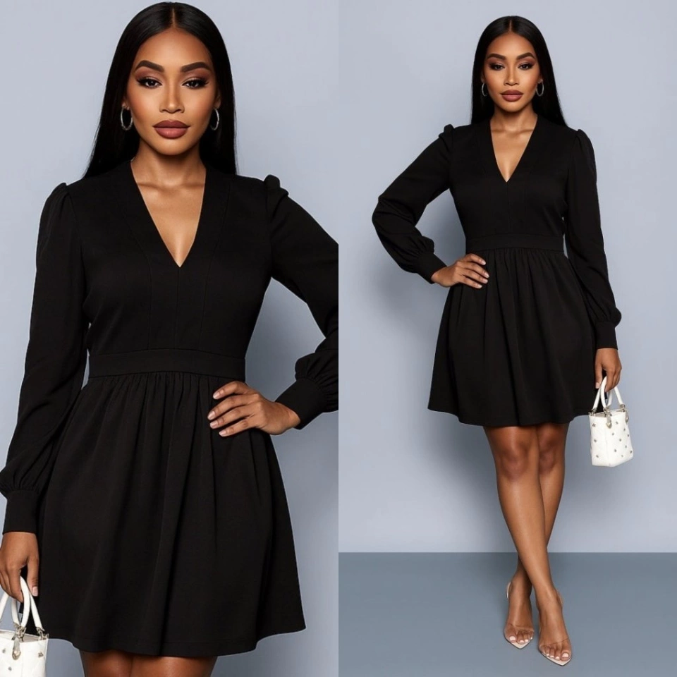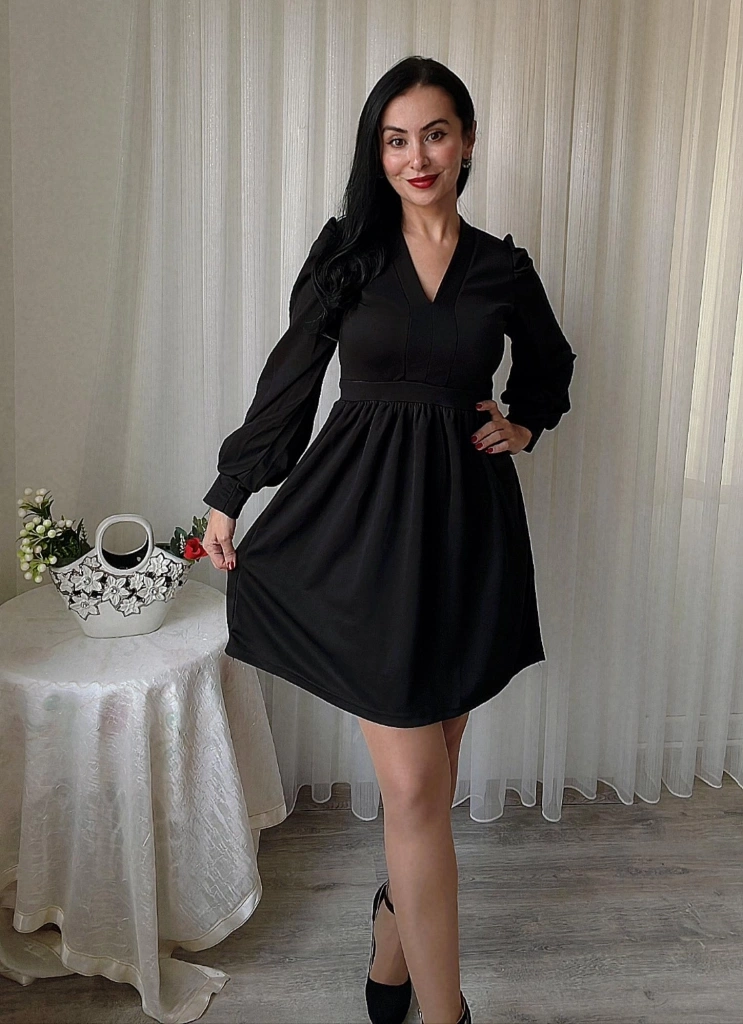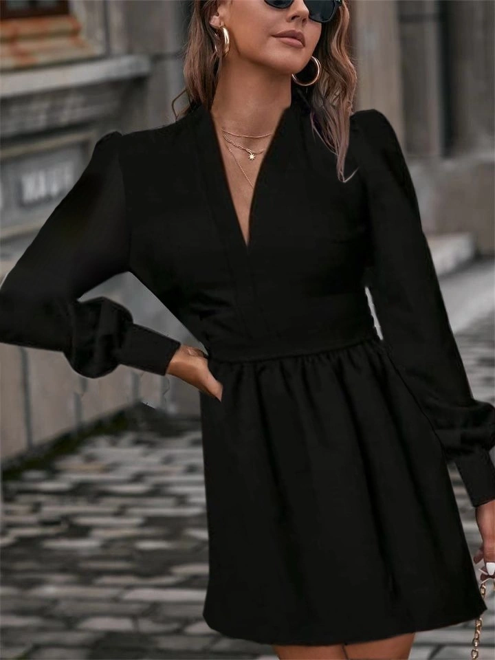Kadın Uzun Kollu V Yaka Belden Hafif Pileli Scuba Krep Mini Boy Elbise