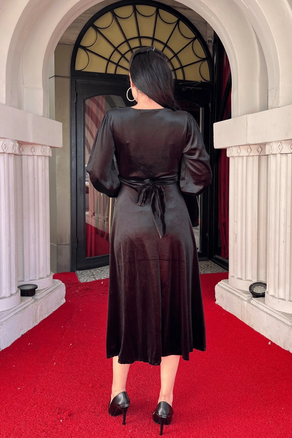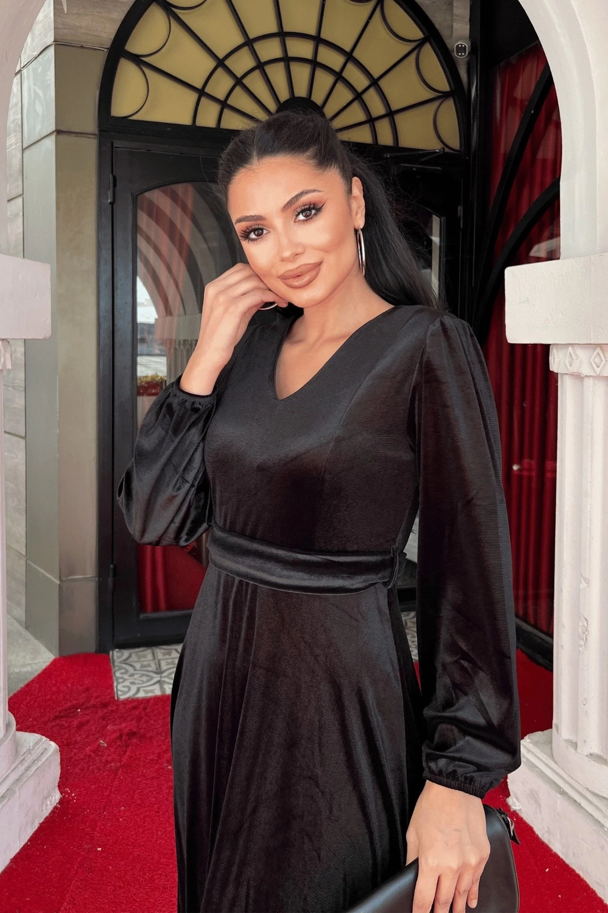Kadın Uzun Kollu V Yaka Kuşak Dahil Kadife Kumaş Midi Boy Elbise