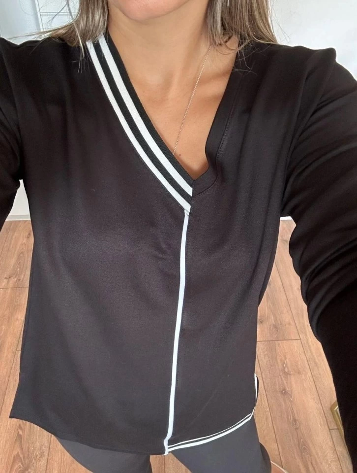 Kadın Uzun Kollu V Yaka Ribana Detay Kristal Kumaş Bluz