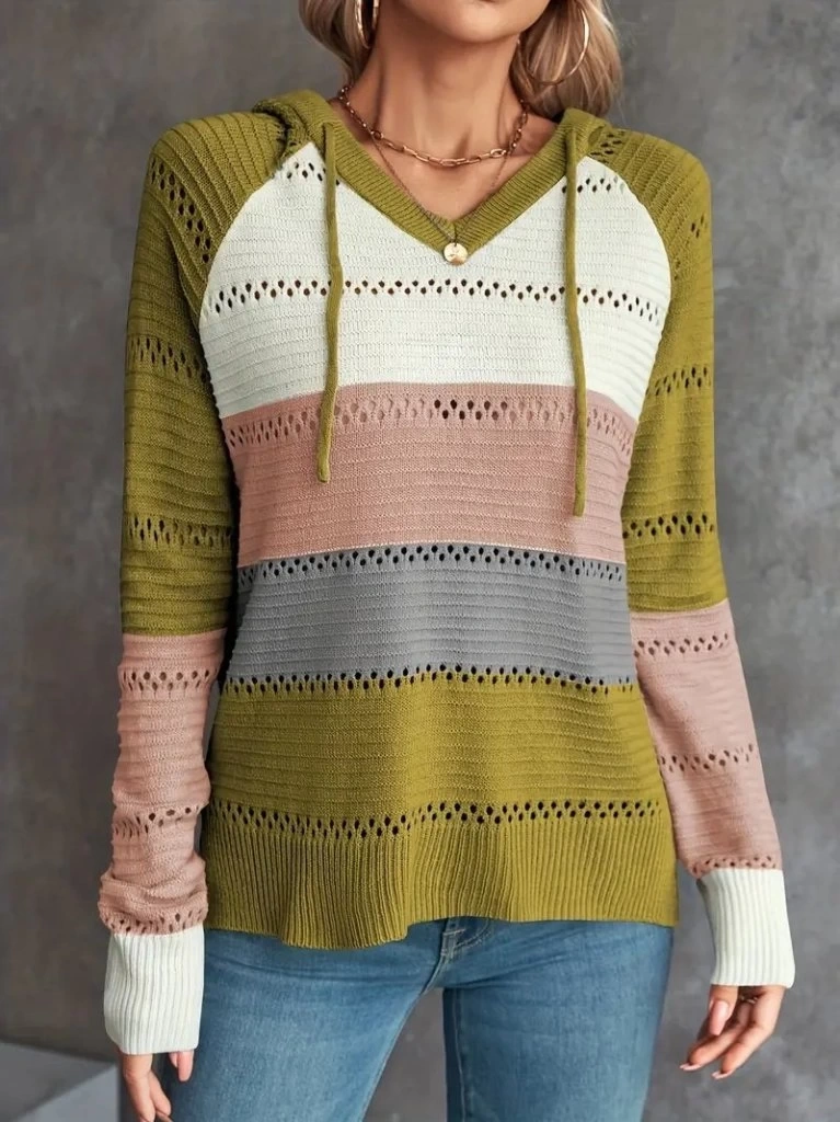 Kadın Uzun Kollu V Yakalı Bağcıklı Kapşonlu Triko Bluz