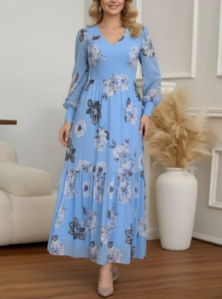 Kadın Uzun Kollu V Yakalı çiçek Desenli Maxi Süprem Elbise