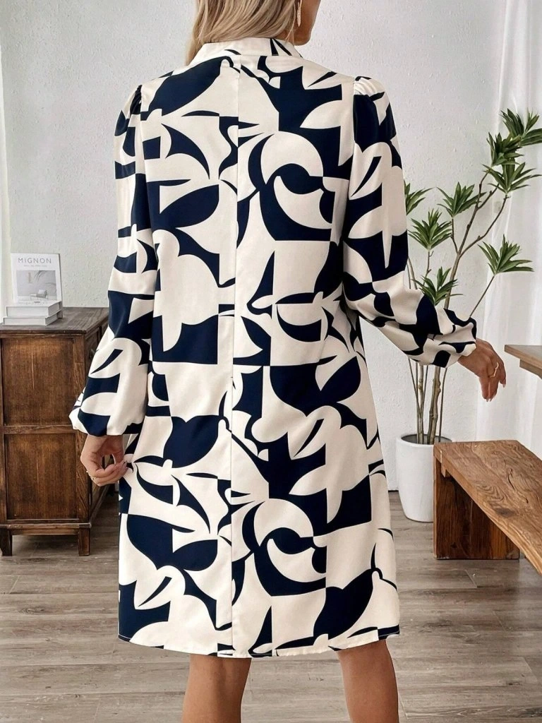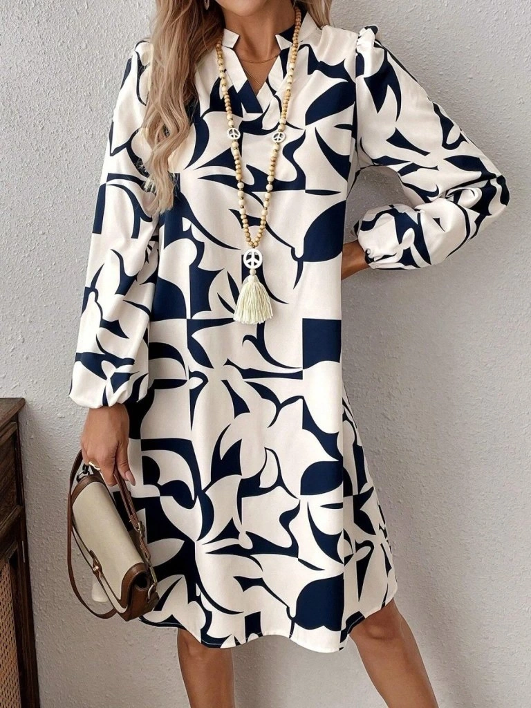 Kadın Uzun Kollu V Yakalı Desenli Modal Mini Elbise
