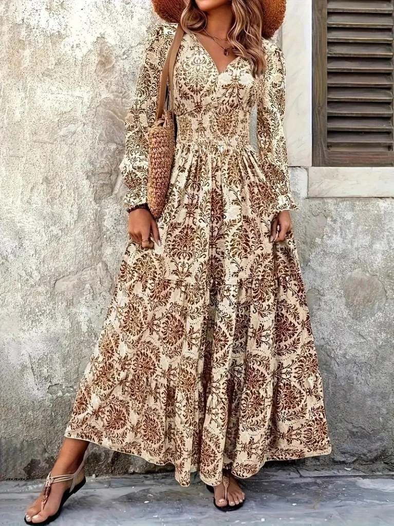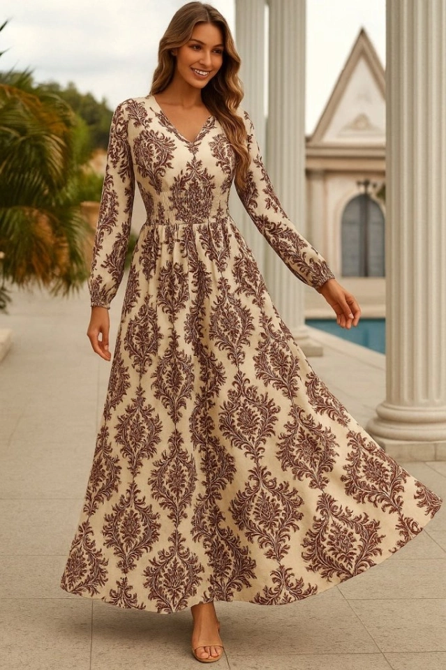 Kadın Uzun Kollu V Yakalı Desenli Süprem Elbise