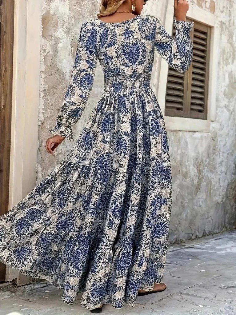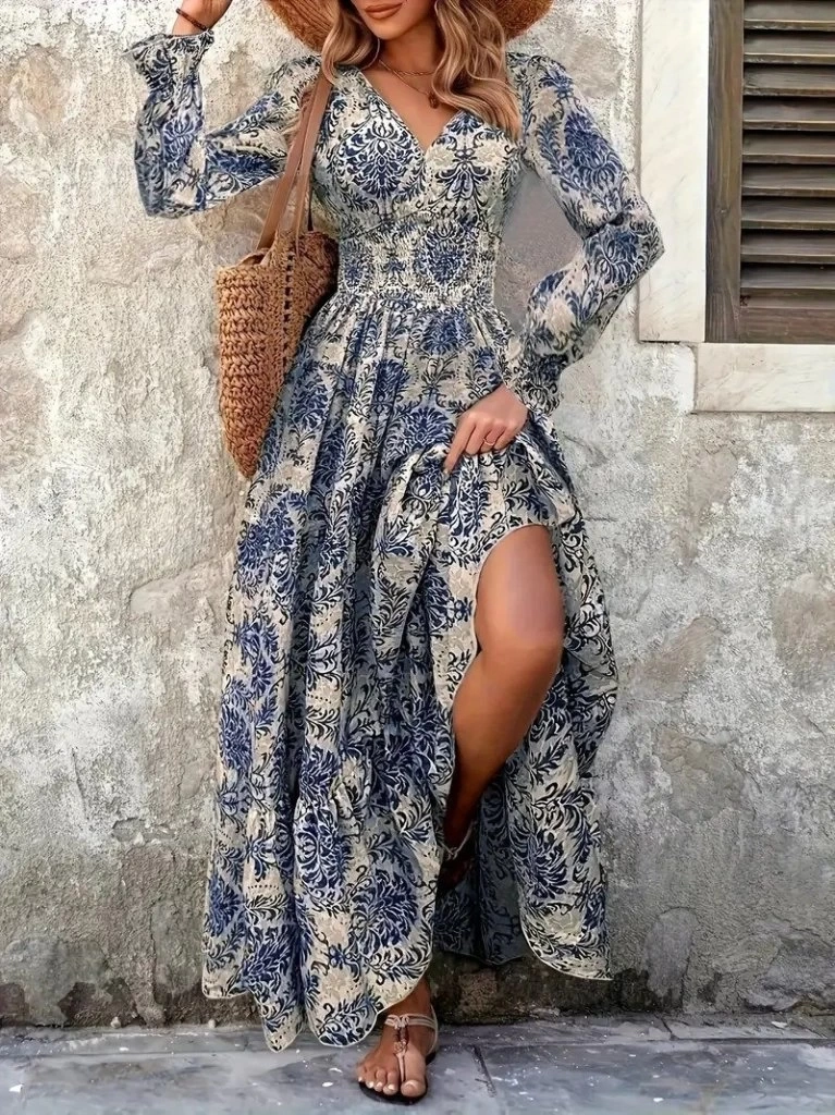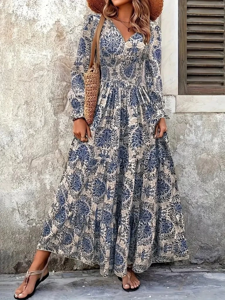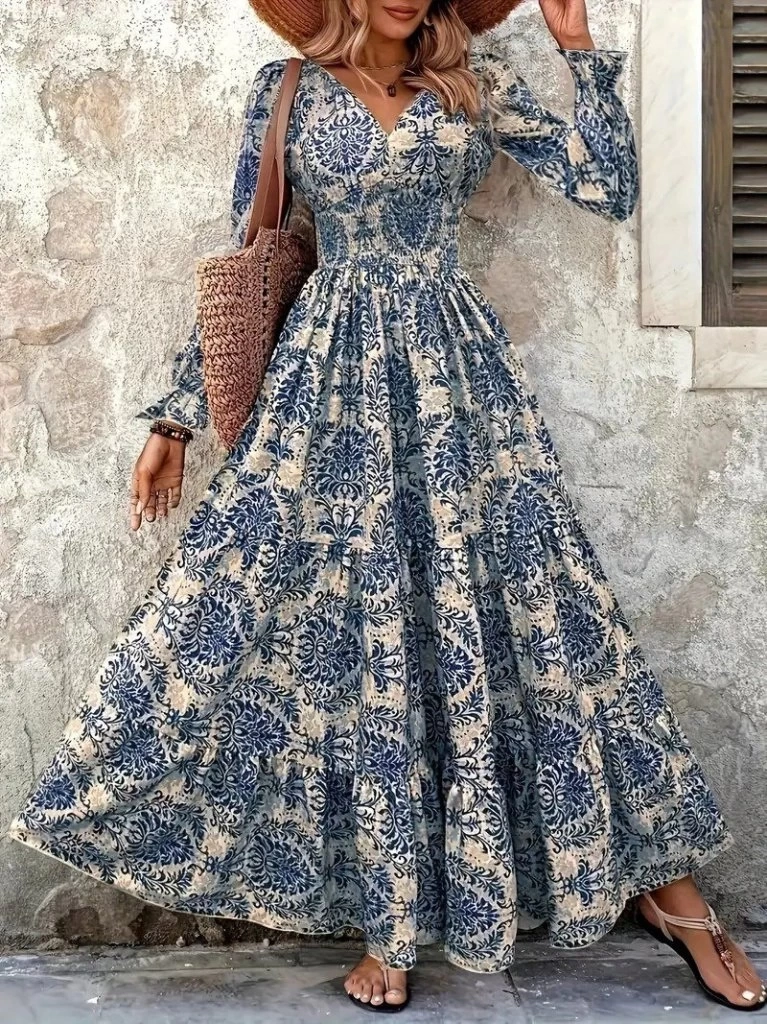 Kadın Uzun Kollu V Yakalı Desenli Süprem Elbise
