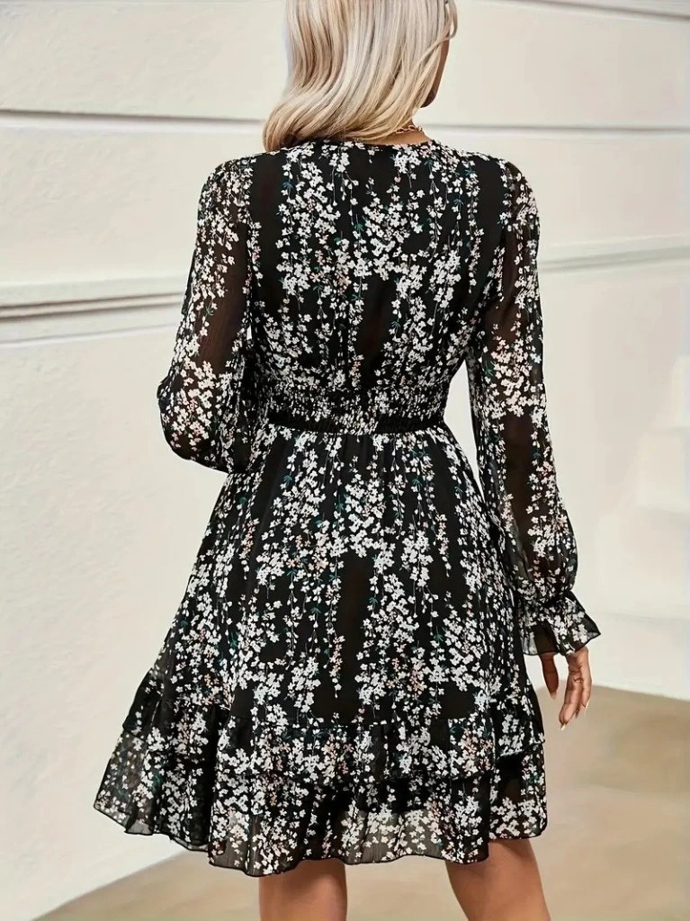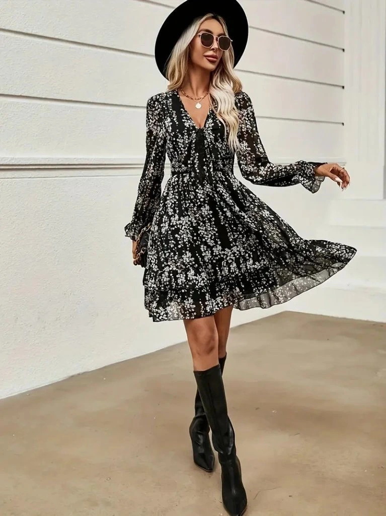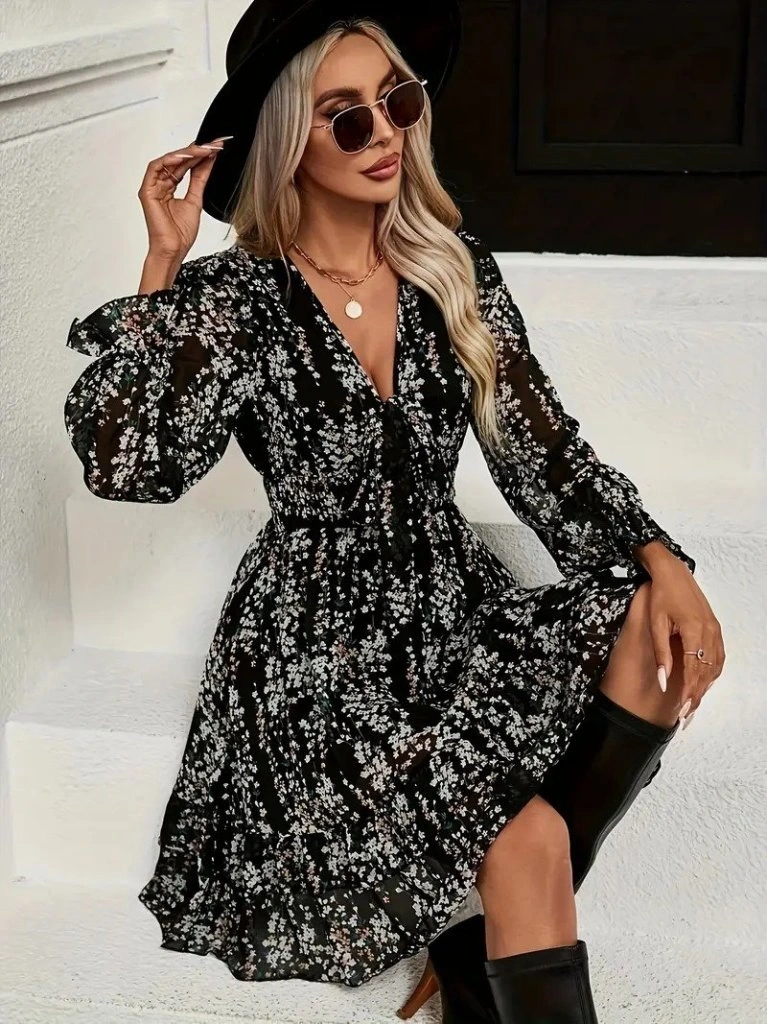 Kadın Uzun Kollu V Yakalı Fırfırlı Ve Bağcıklı şifon Mini Elbise