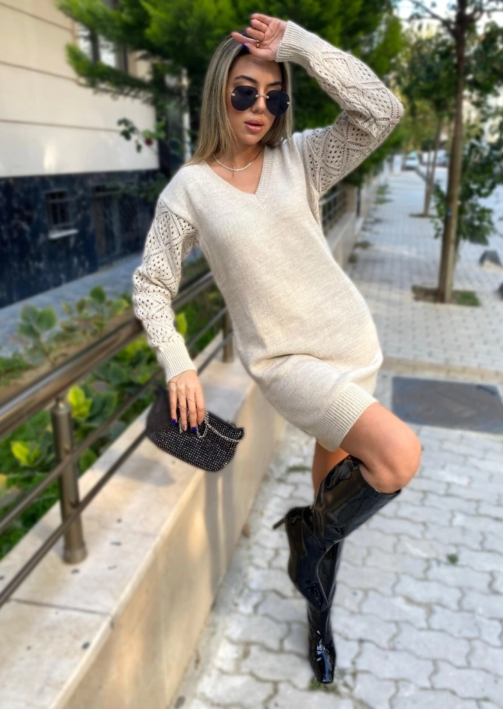 Kadın Uzun Kollu V Yakalı Mini Triko Elbise