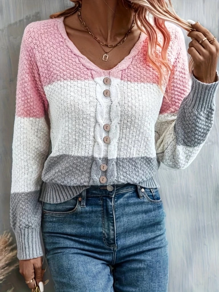Kadın Uzun Kollu V Yakalı önden Düğmeli çok Renkli Bluz