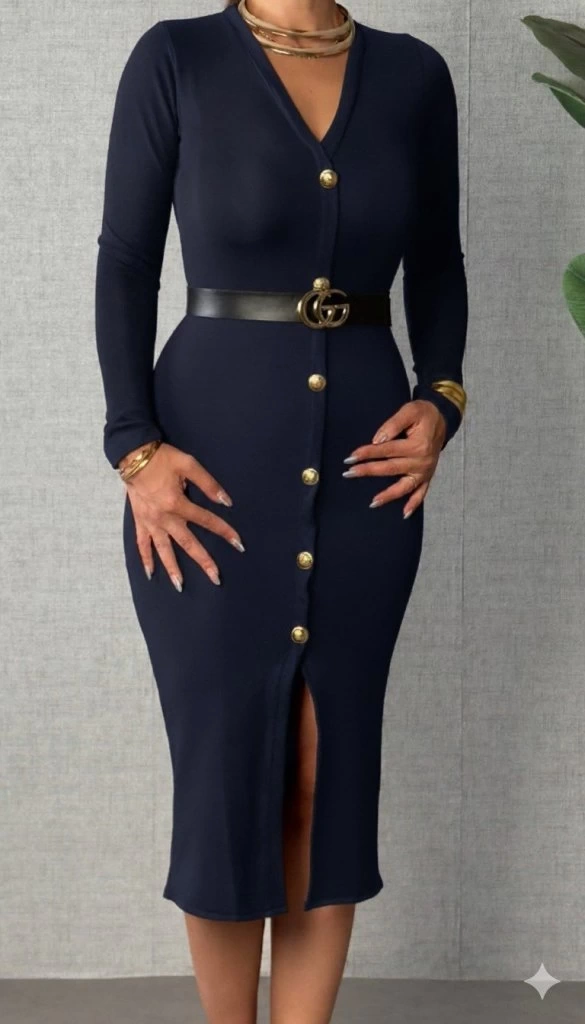 Kadın Uzun Kollu V Yakalı önden Düğmeli Yırtmaçlı Modal Midi Kemersiz Elbise