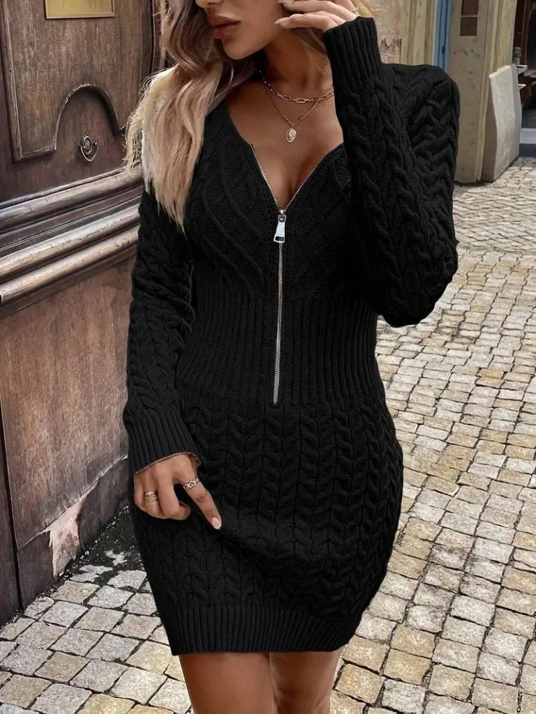 Kadın Uzun Kollu V Yakalı önden Fermuarlı Kısa Triko Elbise