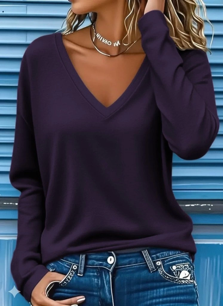 Kadın Uzun Kollu V Yakalı Viskon Iki Iplik Mürdüm Renk Bluz