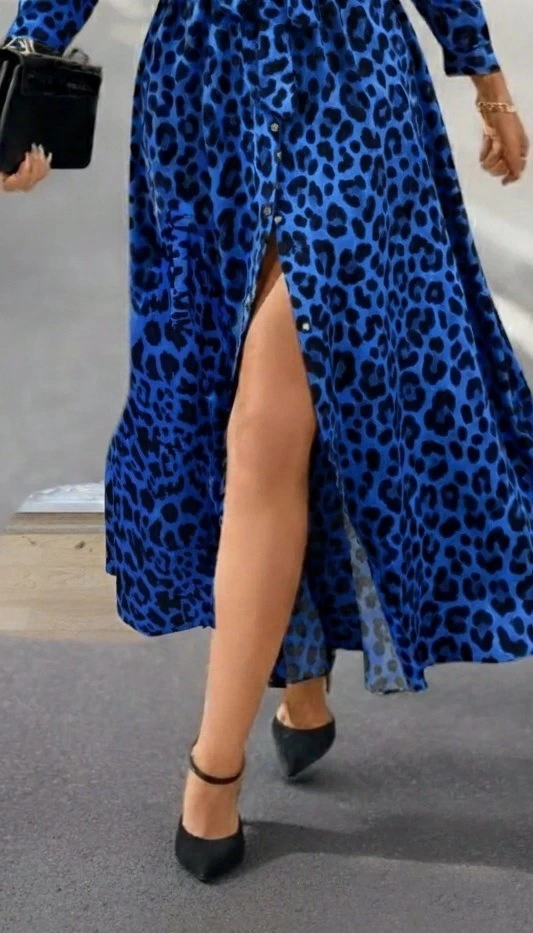 Kadın Uzun Kollu Yakalı Belden Kuşaklı Leopar Desenli Modal Uzun Elbise