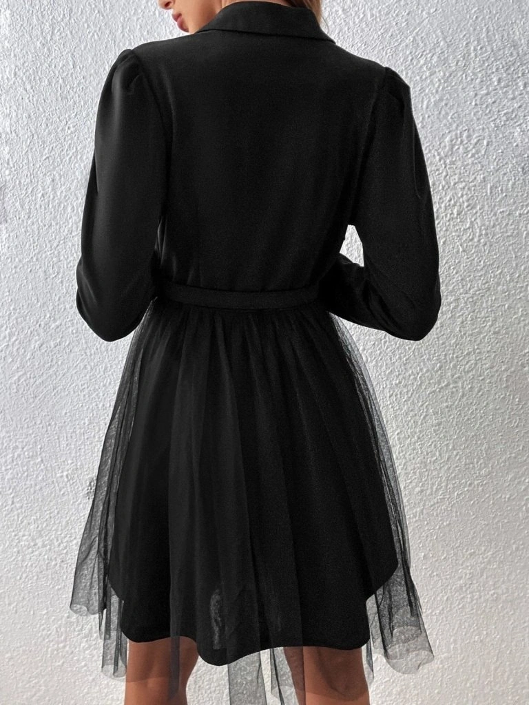 Kadın Uzun Kollu Yakalı Belinde Kemer Detaylı Mini Tüllü Ithal Krep Elbise