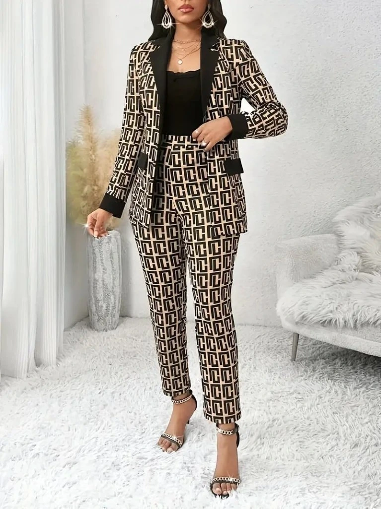 Kadın Uzun Kollu Yakalı Desenli Dalgıç Ceket Bluz Ve Pantolon üçlü Takım