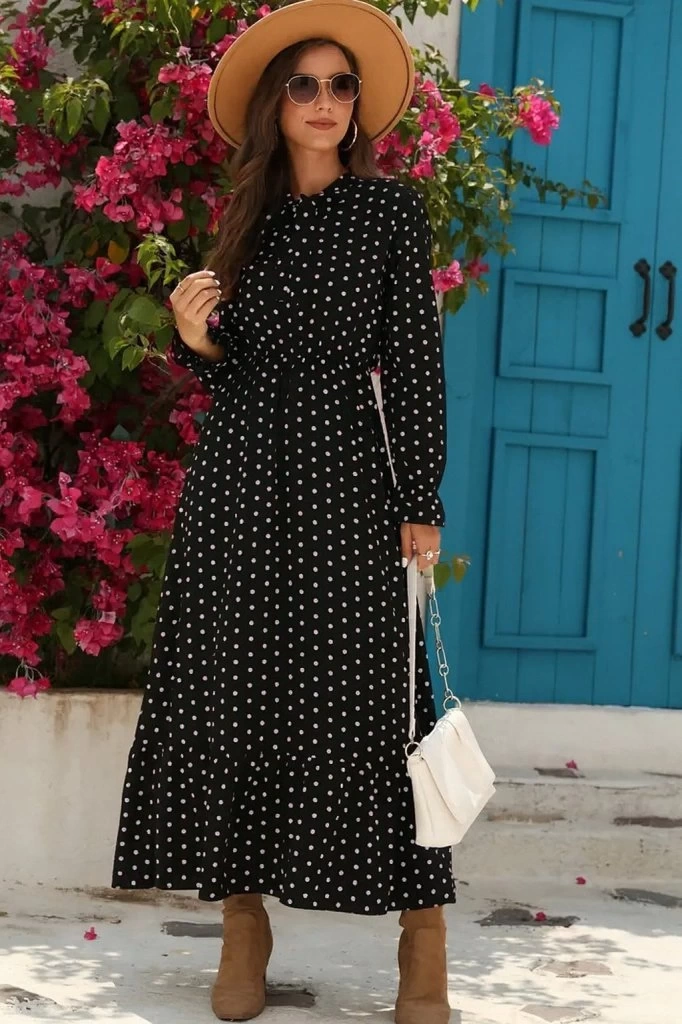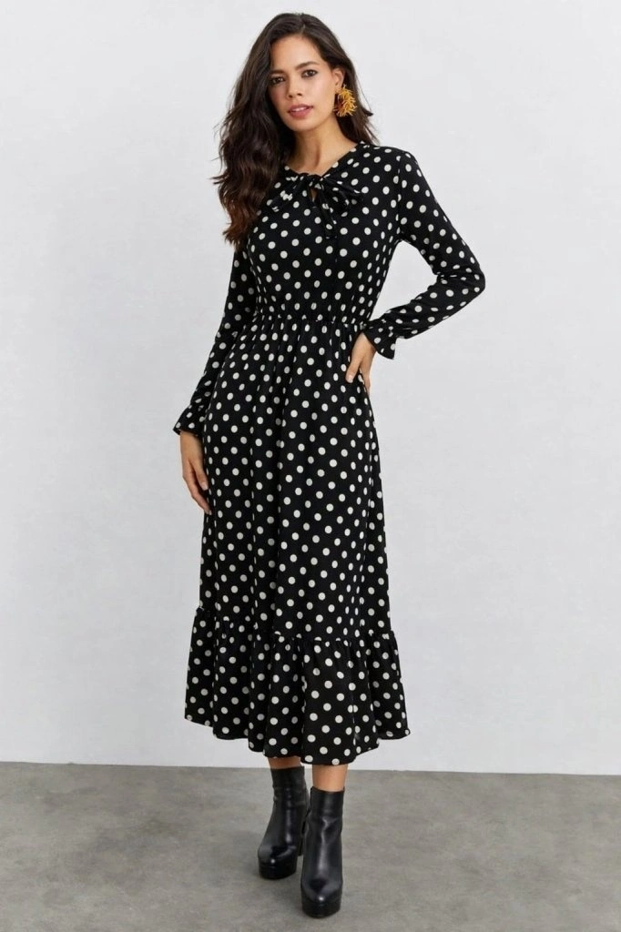 Kadın Uzun Kollu Yakası Bağcıklı Uzun Puantiyeli Krep Maxi Elbise