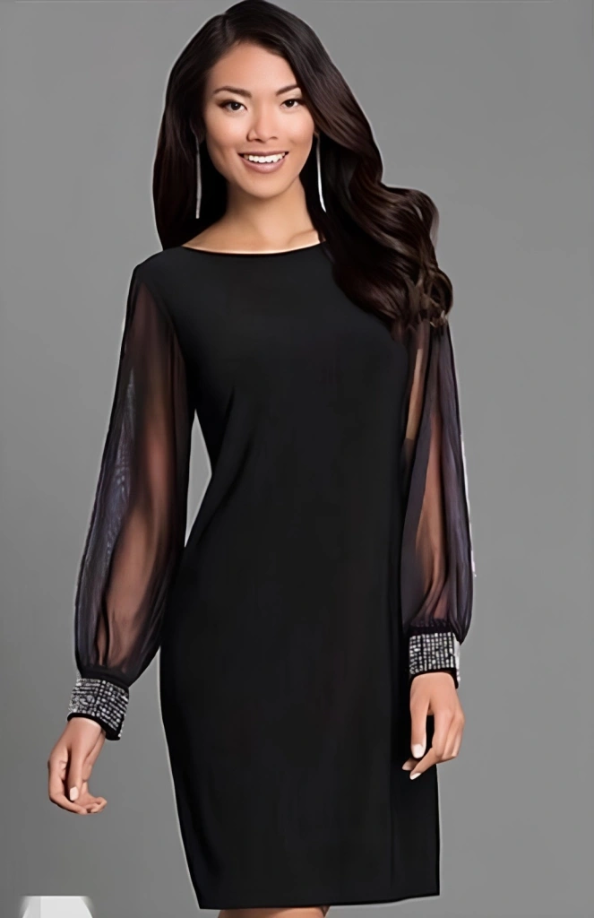Kadın Uzun Kollu Yakası Yanlardan Hafif Açık Kollar Tül Ve Taş Detay Kısa Krep Elbise