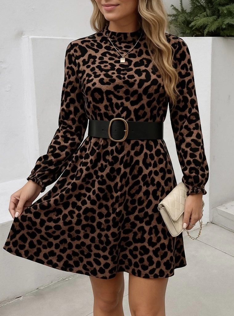 Kadın Uzun Kollu Yarı Balıkçı Yaka Leopar Desenli Kadife Elbise