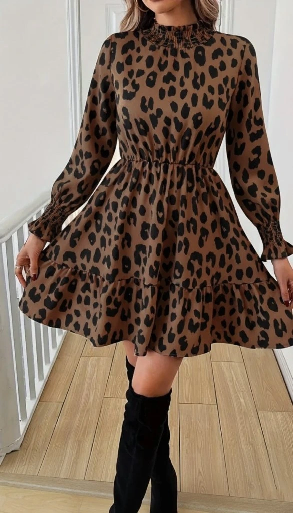 Kadın Uzun Kollu Yarı Balıkçı Yaka Leopar Desenli Modal Mini Elbise