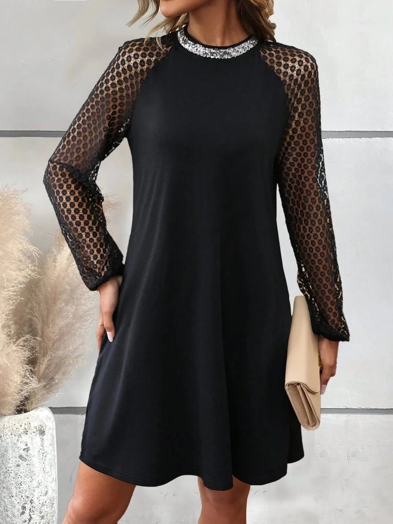Kadın Uzun Kollu Yarı Balıkçı Yaka Pulpayetli Kolları Dantel Detaylı Mini Ithal Krep Elbise